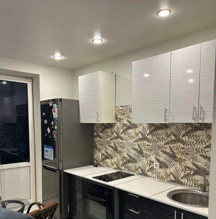 - современный кухонный гарнитур со встроенной варочной панелью и духовым шкафом, холодильник, стиральная машина, телевизор;