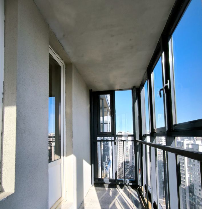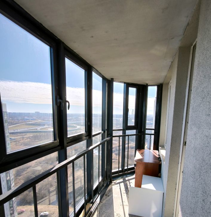 Большой балкон (4,7 кв.м.) с панорамным остеклением от застройщика, вид на вантовый мост и КАД (окно на Ю-В)