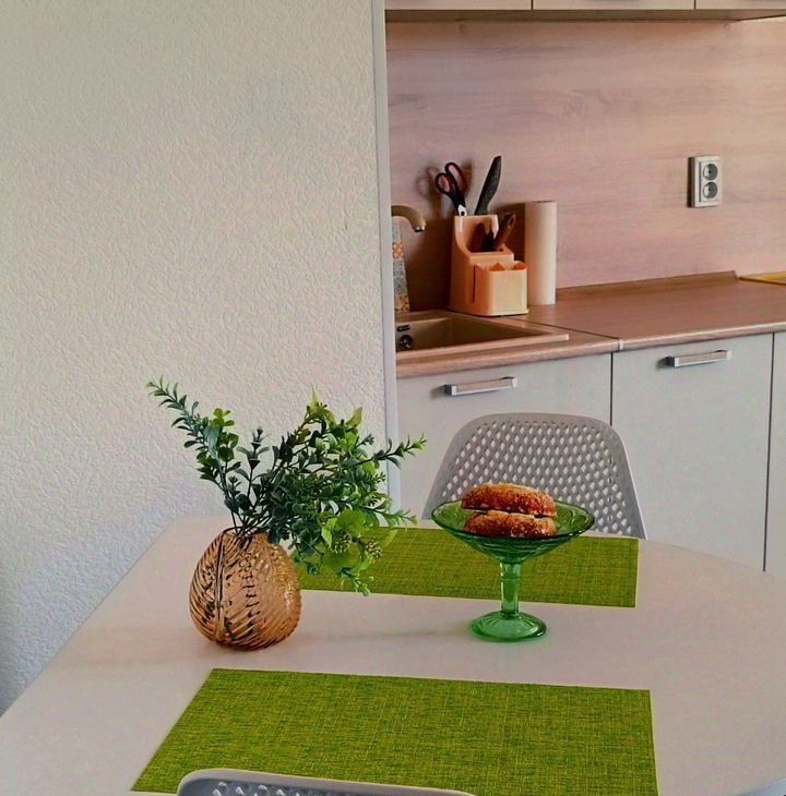 Постельное белье и полотенца в наличии. Все для готовки и сервировки стола.