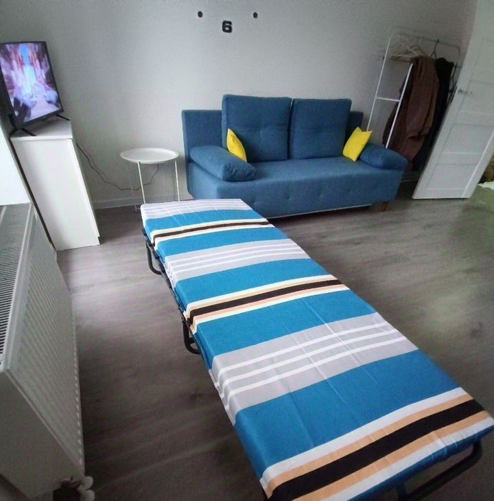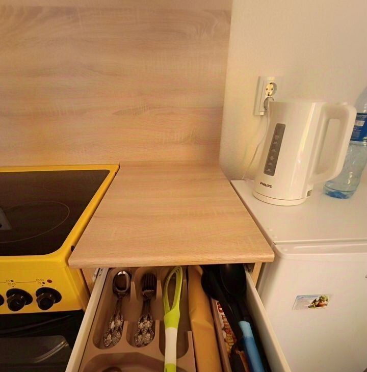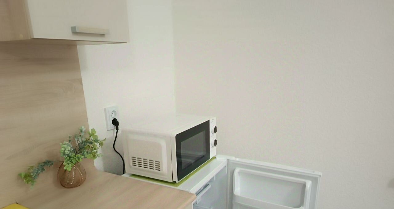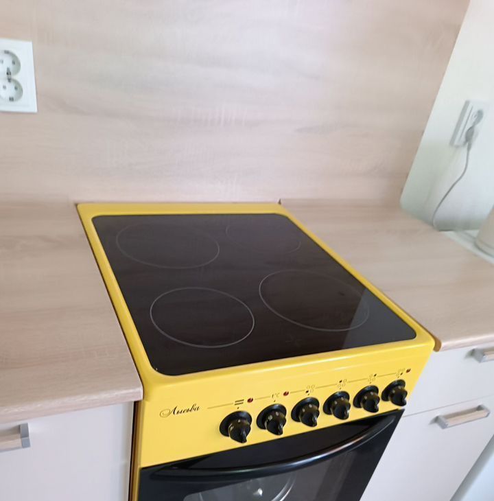 В квартире все есть для жизни. Кухонный гарнитур с электрической плитой, компактный, небольшой холодильник, двухспальной диван, раскладной стол и стулья, стулья, место для вещей и обуви, в ванной стиральная машина Индезит, полно размерная ванная, раковина с навесной тумбой и конечно унитаз.