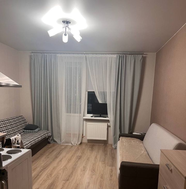 Уютная студия, полностью укомплектована для проживания: два раскладных дивана, электроплита, телевизор, стиральная машина, шкаф. Есть небольшой холодильник с морозильной камерой. Санузел совмещённый (ванна + туалет).