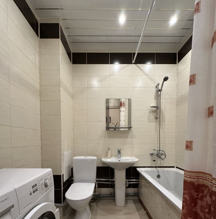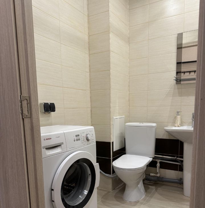 В квартире - два раскладных дивана, шкаф для одежды, телевизор. На кухне - электрическая плита, духовой шкаф, вытяжка, зоны для хранения, комплект посуды, обеденный стол, холодильник, чайник. Просторная ванная комната, стиральная машина, сушилка для белья.
