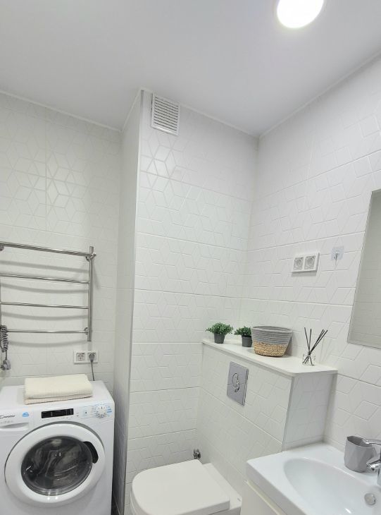Апартаменты выполнены с дизайнерским ремонтом, что придаёт им современный и привлекательный вид. В квартире есть вся необходимая мебель как на кухне, так и в комнате. Из техники присутствуют кондиционер, холодильник, телевизор и стиральная машина, поэтому можно сразу заселяться и наслаждаться комфортом. Ванная комната оснащена ванной, что добавляет дополнительное удобство.