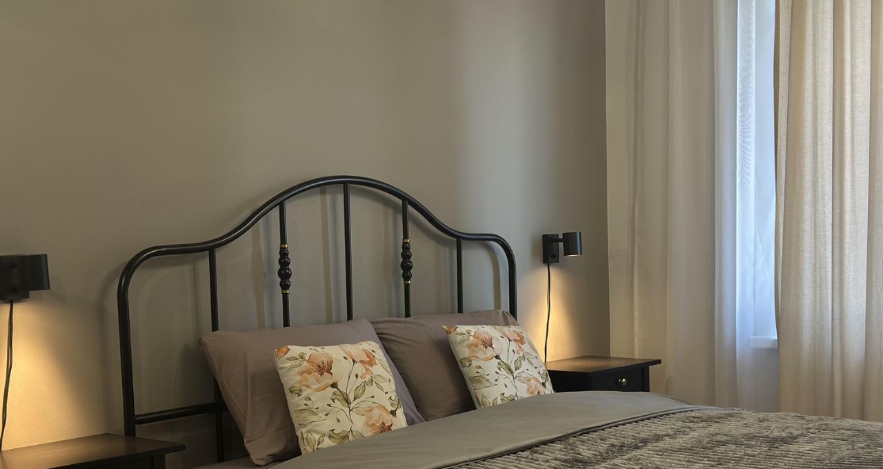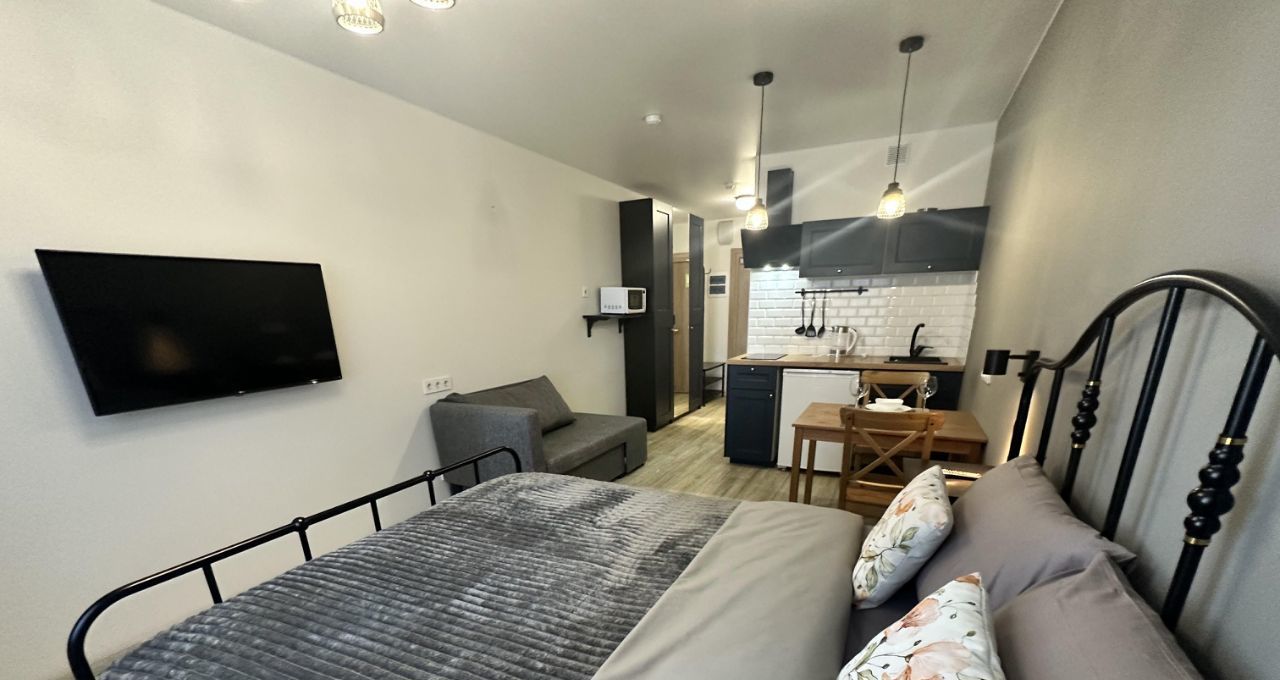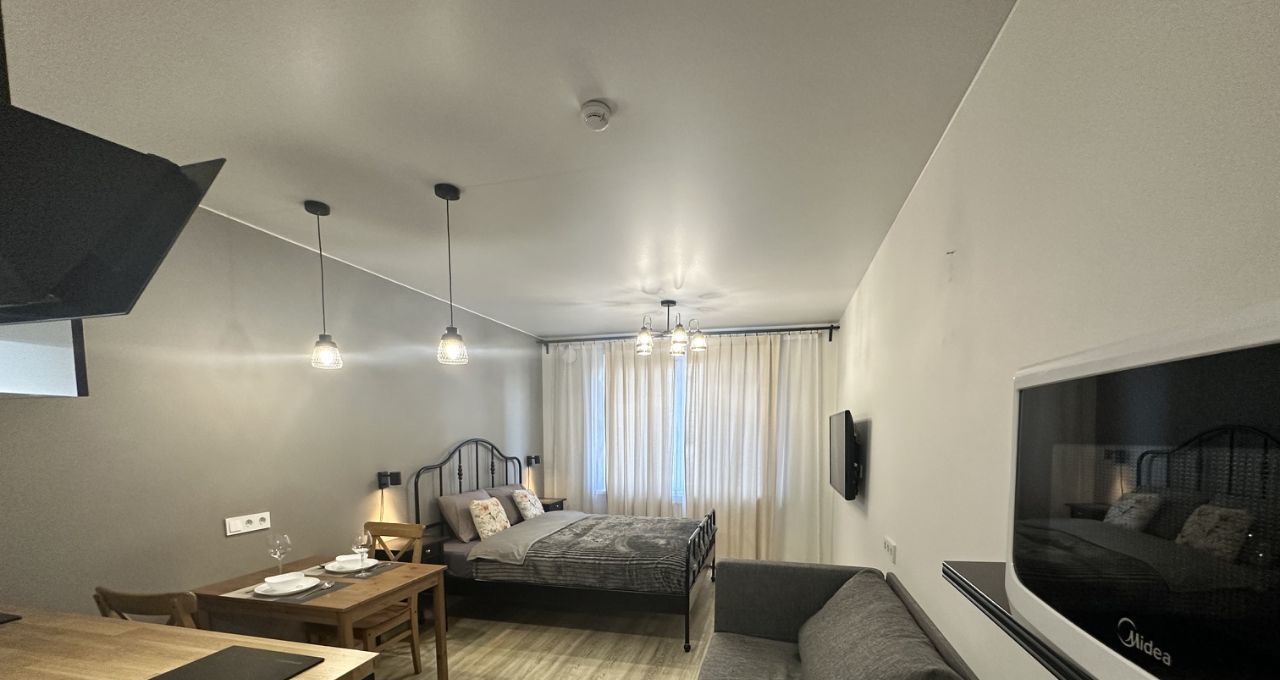 Комфортный сон: В студии установлена удобная двуспальная кровать, где с комфортом разместятся двое взрослых. Вам гарантирован крепкий сон после насыщенного дня.