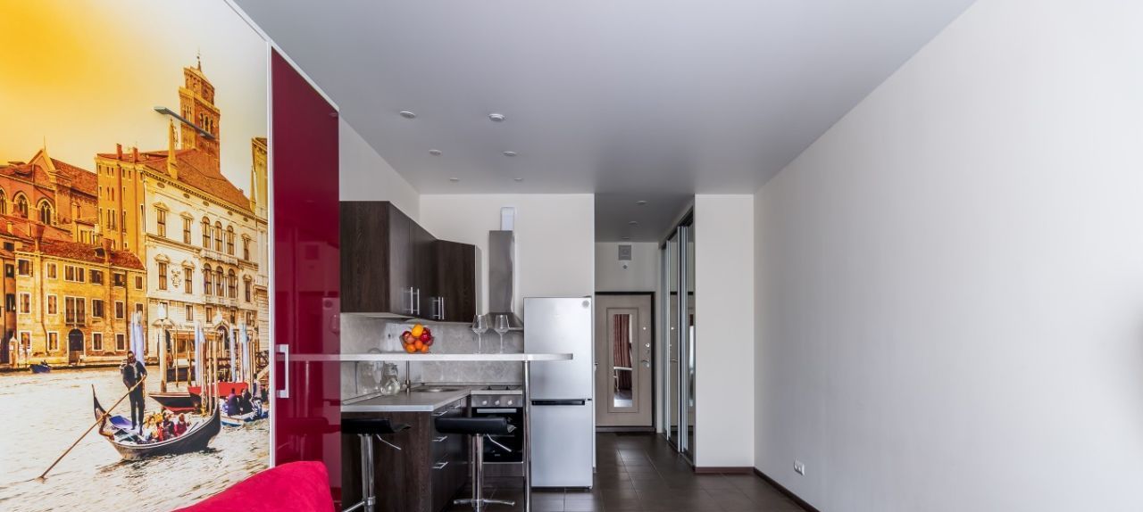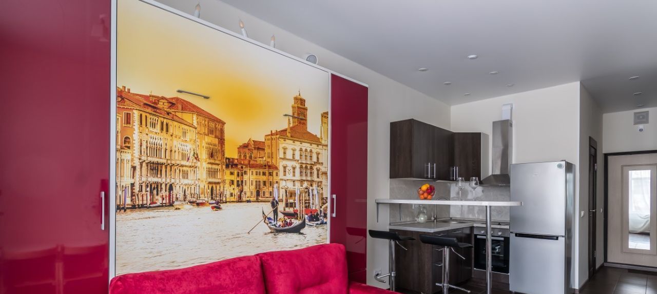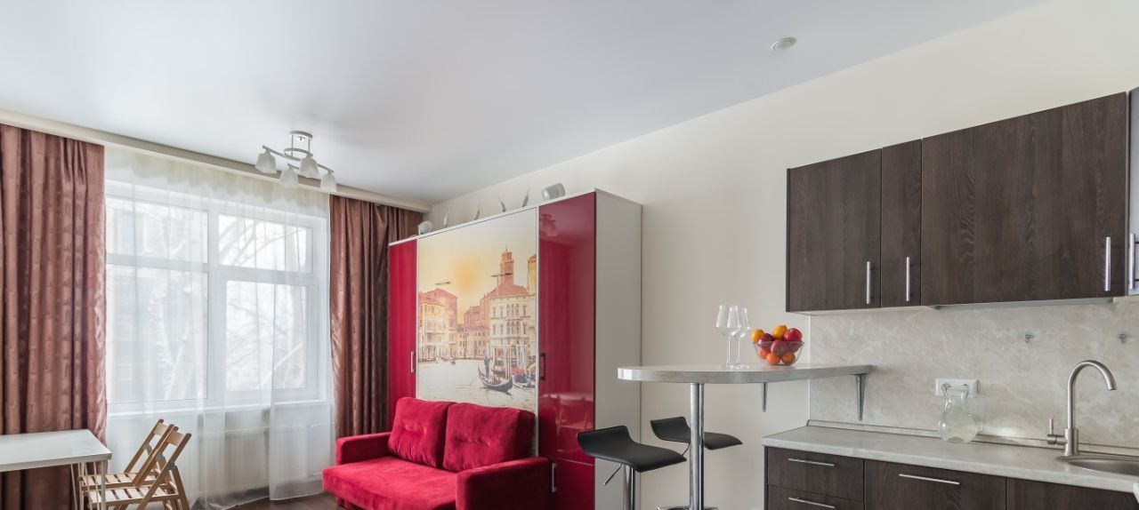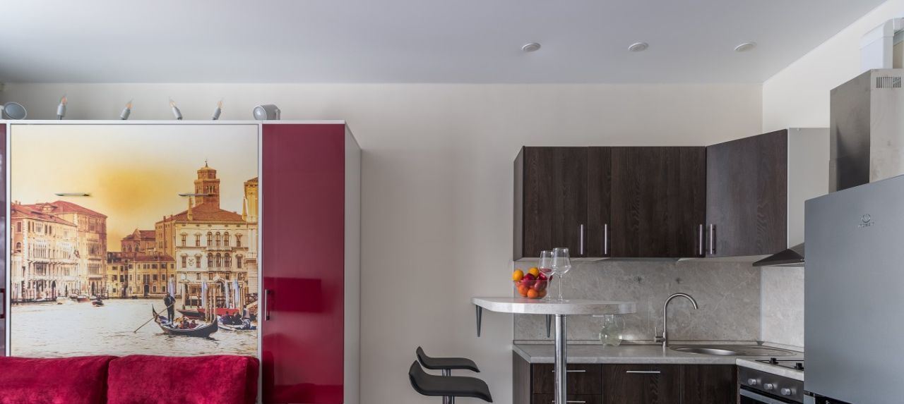 ДИЗАЙНЕРСКИЙ РЕМОНТ: Особенность студии- это мебель-трансформер: полноценная двухспальная кровать с матрасом фирмы Аскона, диван, небольшой стол и стулья, вместительные шкафы. Так же есть вся необходимая техника: варочная панель, духовой шкаф, вытяжка, посудомоечная машина, холодильник, СВЧ, стиральная машина, цифровое телевидение, смарт ТВ, WI FI.