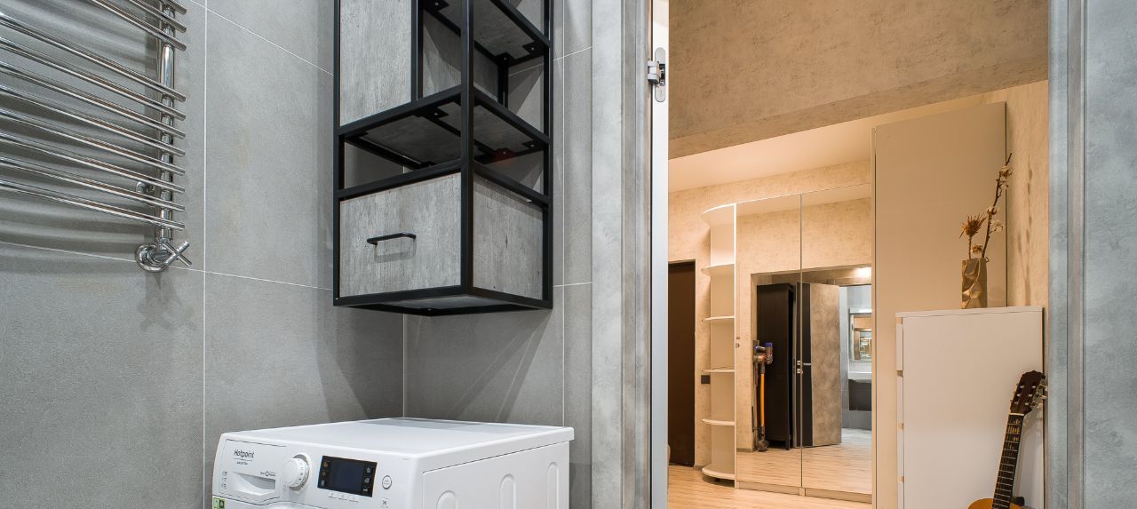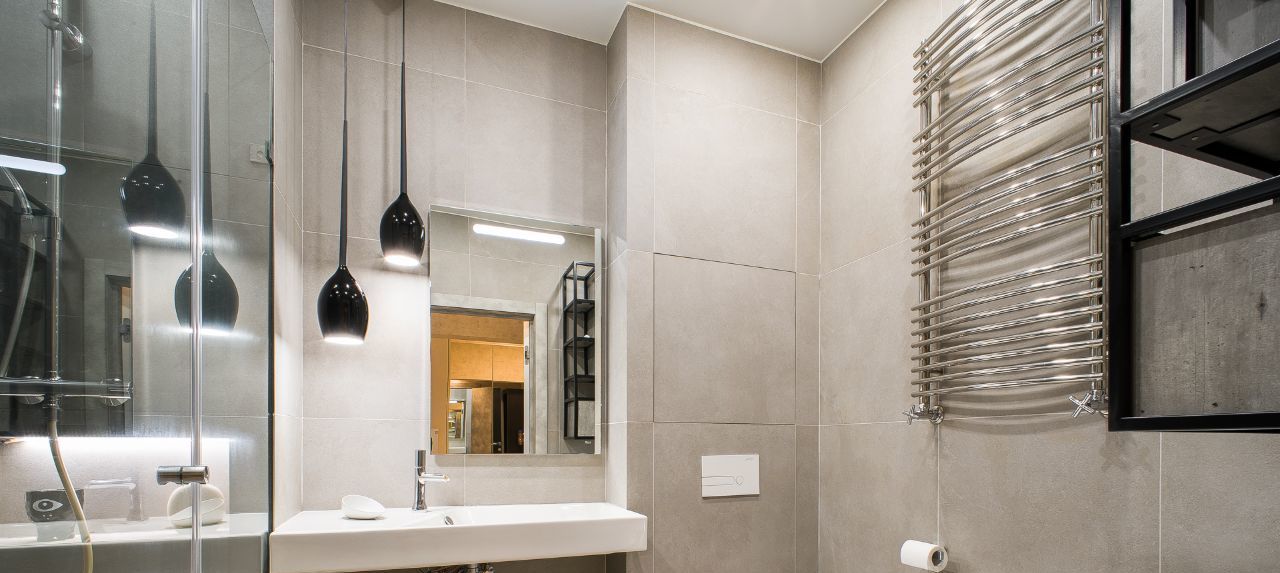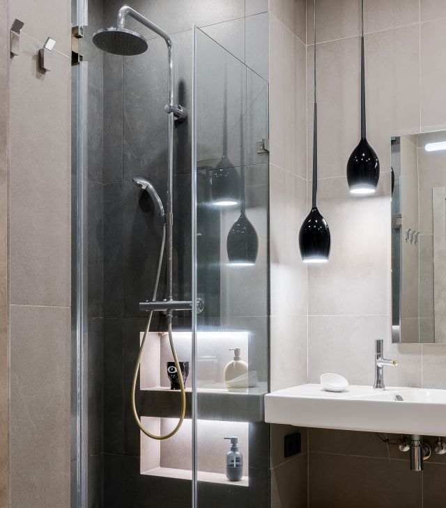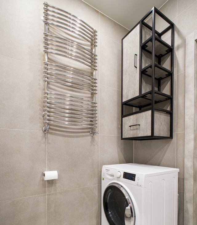 Ванная комната с душевой зоной, большой раковиной и зеркалом. Стиральная машина с функцией сушки. Большой полотенцесушитель - удобен для сушки белья.