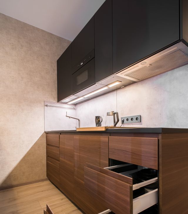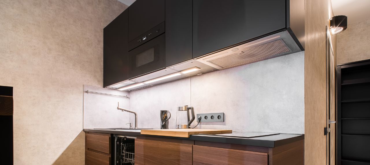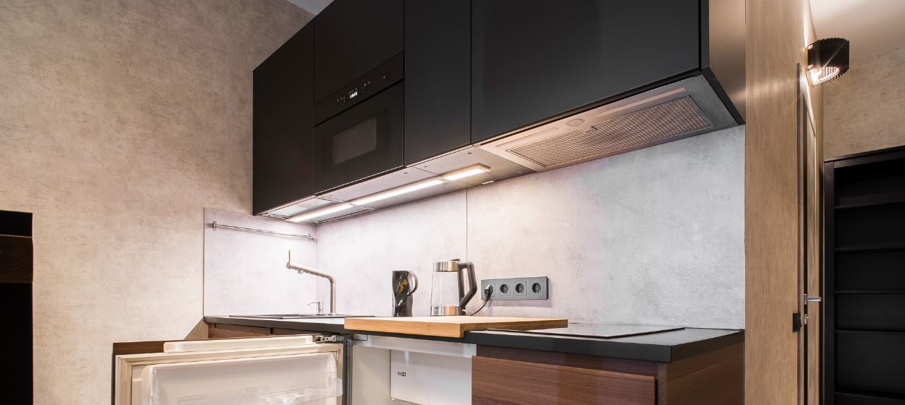 Современная кухня с холодильником, посудомоечной машиной, микроволновой печью и индукционной варочной панелью с 2 комфорками.