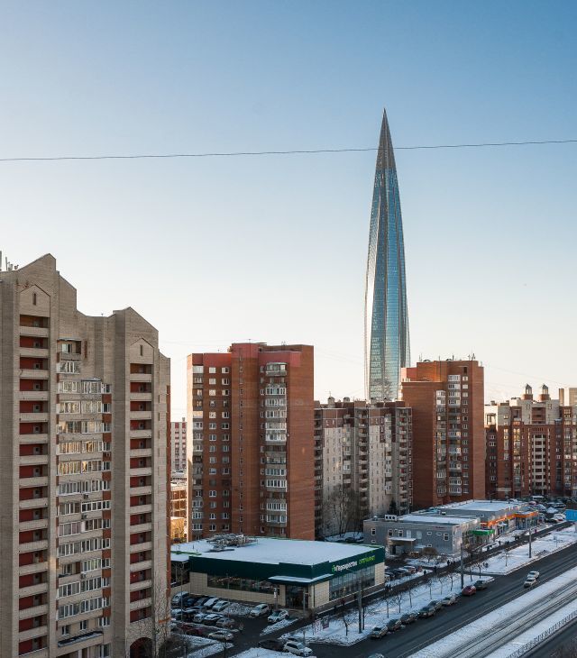 Из окна вид вдаль на улицу Савушкина и Лахта Центр.