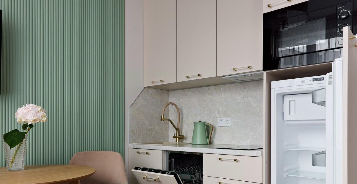 — полностью оборудованная кухня: холодильник, микроволновка, чайник, посуда и приборы,