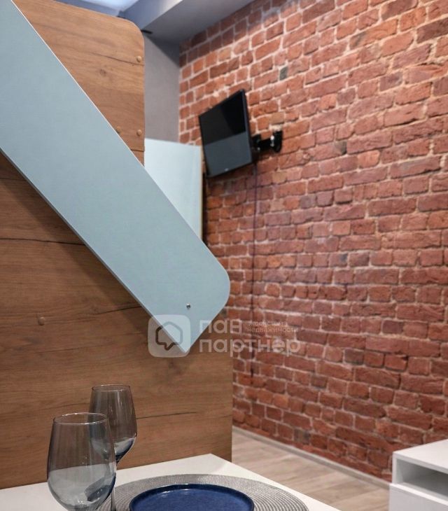 Высота потолков 3,5 м. Спальное место организовано на втором уровне, за счёт чего сохраняется ощущение пространства. Продуманная планировка, есть места для хранения.