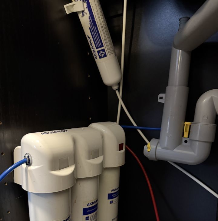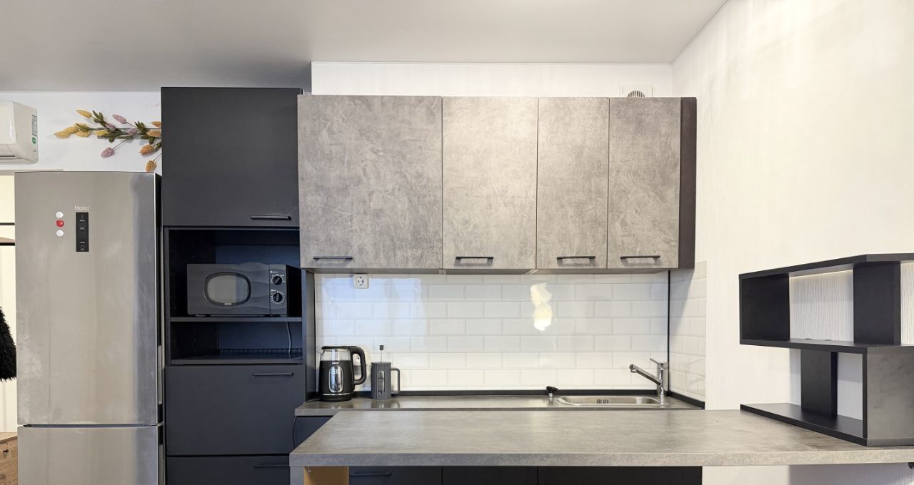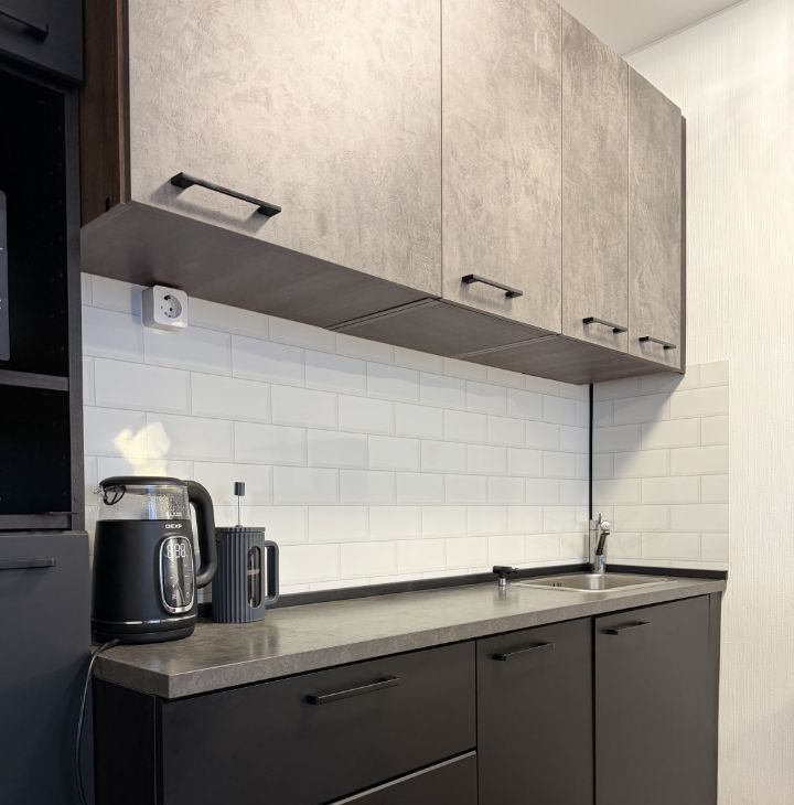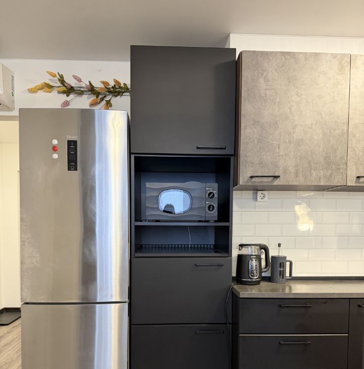 Стильная кухонная линия с техникой (холодильник, варочная панель, микроволновая печь, чайник). Многоступенчатая система очистки воды.