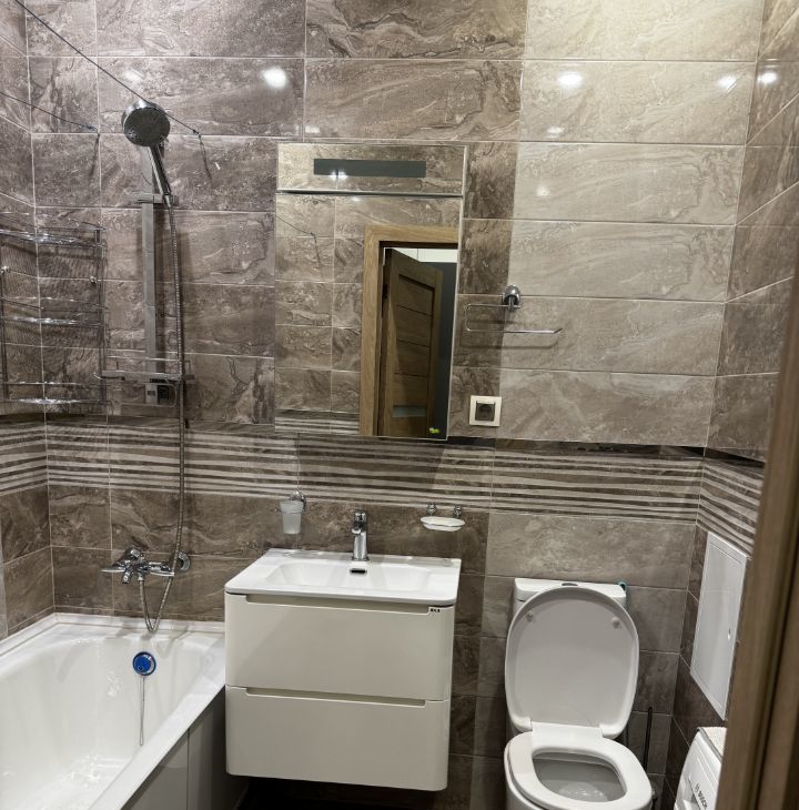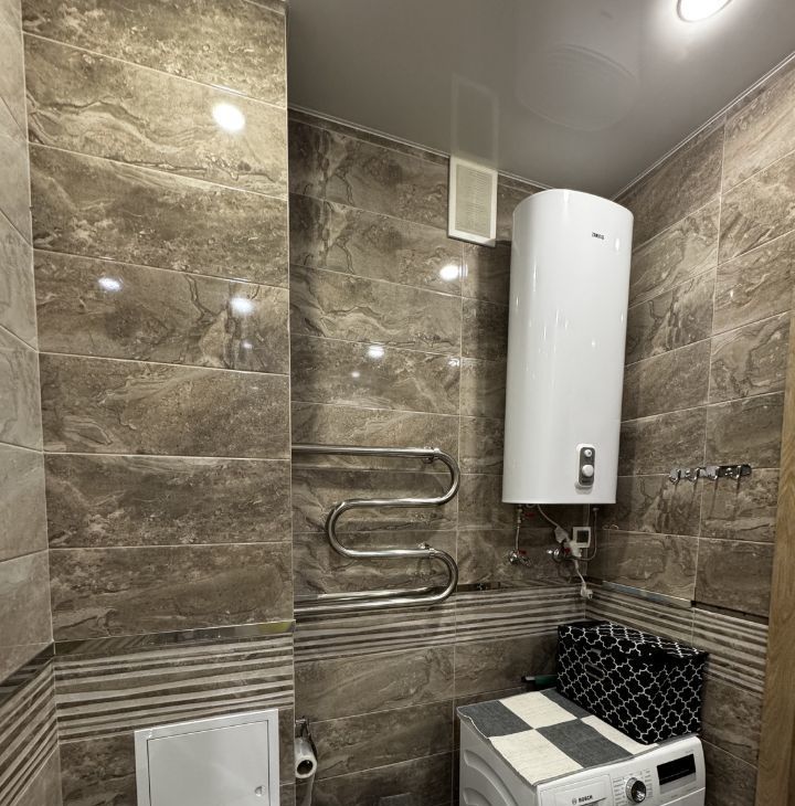 Санузел совмещенный, оформлен качественной плиткой, оснащен современной сантехникой, водонагревателем и стиральной машиной. Балкон застекленный.