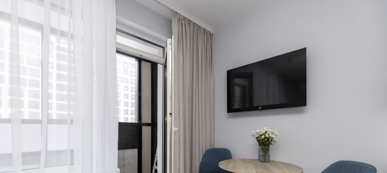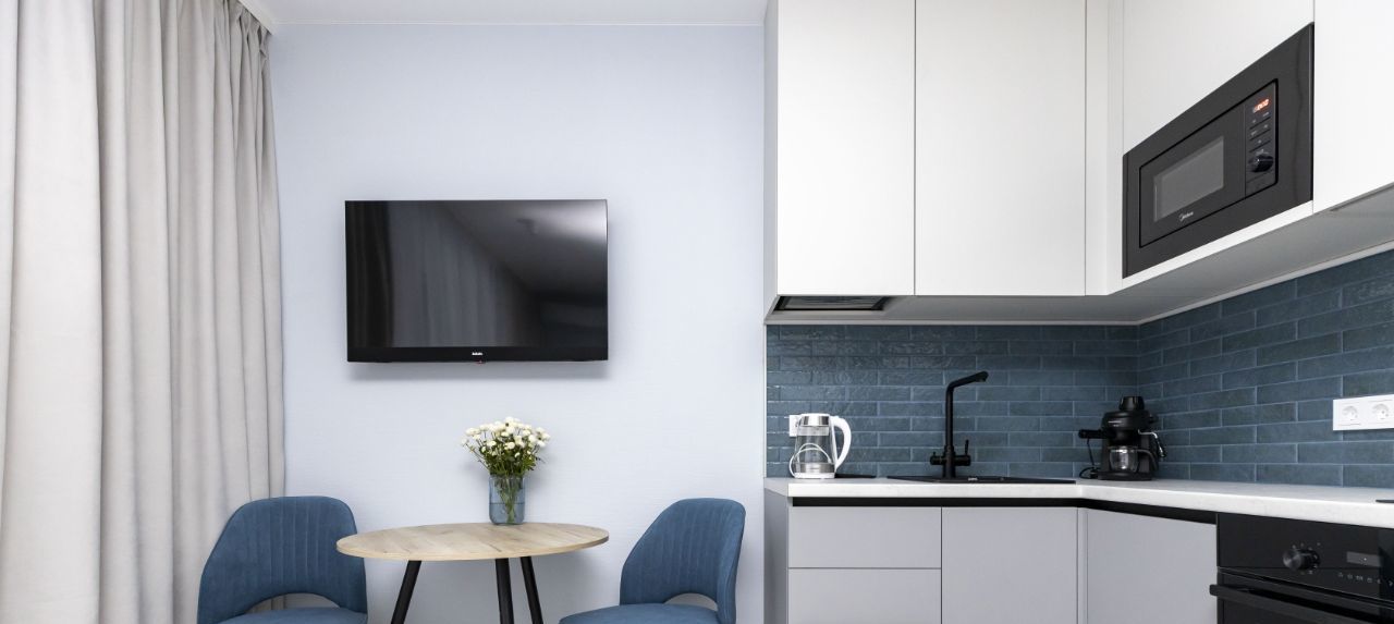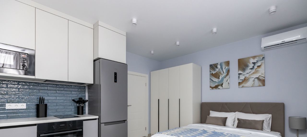 Полностью оборудованная кухня с посудомоечной машиной. Все необходимое для проживания уже есть: посуда, техника. Двухспальная кровать, телевизор, вместительный шкаф. Wi-Fi подключен, есть кофемашина, пылесос, утюг.