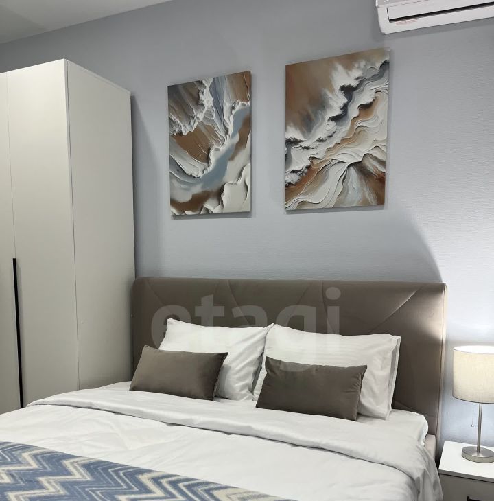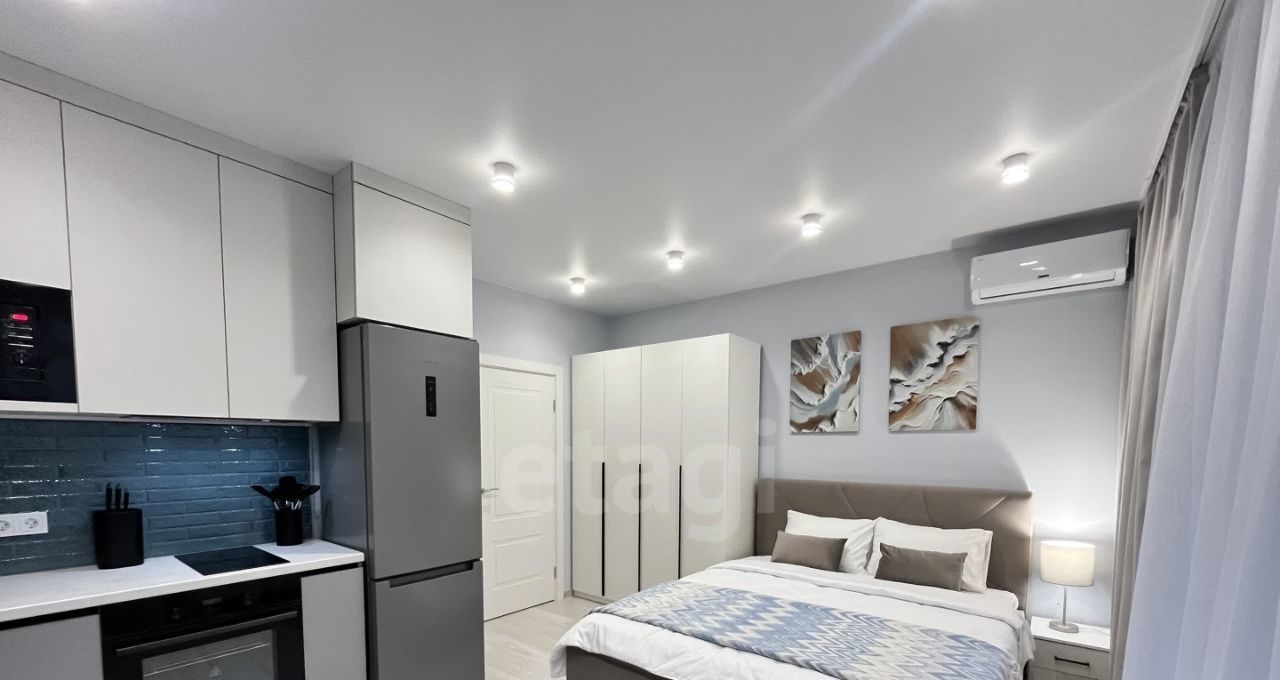 Студия разделена на спальную и кухонную зоны, что создаёт атмосферу уюта и функциональности. В спальной зоне вас ждет большая двуспальная кровать и вместительный шкаф для хранения вещей.