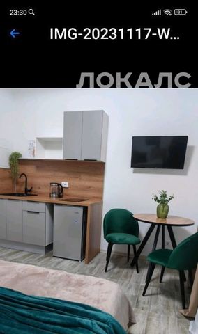 Студия оформлена в дизайнерском стиле. В квартире есть всё необходимое для комфортного проживания: на кухне и в комнате установлена мебель, также в наличии холодильник, телевизор и стиральная машина. Ванная комната оснащена ванной.