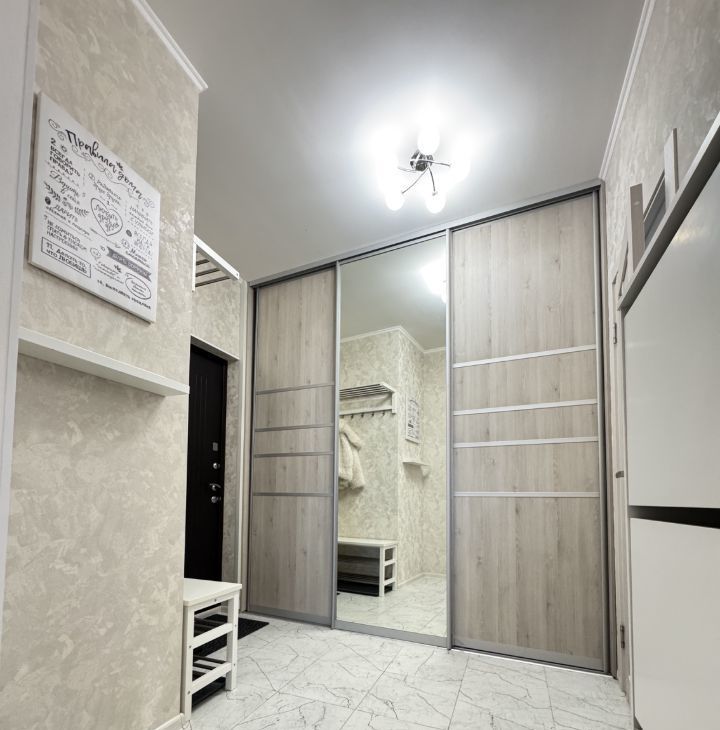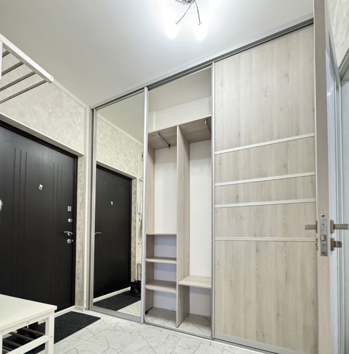 В квартире есть вся необходимая мебель и техника: спальные места, рабочая зона в комнате, большой шкаф-купе, места для хранения, холодильник, стиральная машина, кухонные шкафы, стол, телевизор