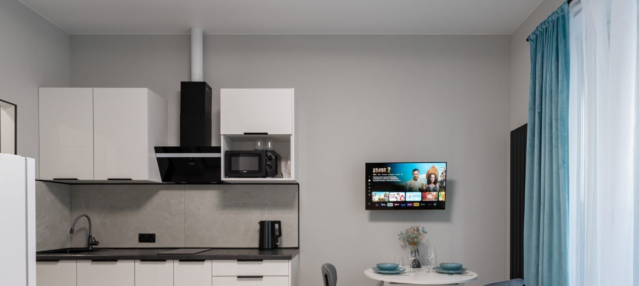 Комфортное размещение 1-2 людей. Обеденный стол раскладывается на 6 (шесть) персон. Быстрый интернет. В кухонной зоне: посудомоечная машина, микроволновка, чайник, индукционная плита, новая посуда для приготовления пищи (кастрюли, сковородка, все столовые приборы); в ванной: стиральная машина, душевая перегородка. Интернет и ТВ проведены.