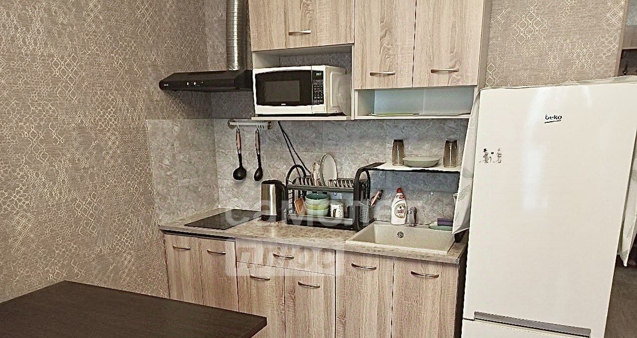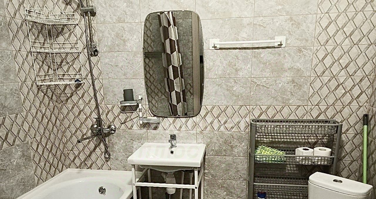 Выполнен современный, дизайнерский ремонт с продуманной планировкой. При входе в квартиру с правой стороны располагается вместительная прихожая с зеркалом и крючками для вашей одежды. С правой стороны располагается совмещенный санузел, в котором есть стиральная машина, ванна. Далее мы проходим в основную комнату, где с правой стороны установлена кухонная зона с холодильником, микроволновкой, варочной панелью и вытяжкой. Есть кухонная утварь для готовки, посуда, столовые приборы. У окна располагается двуспальная кровать. Напротив кровати располагается тумба с телевизором.