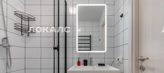 санузел с удобной душевой кабиной, зеркалом с подсветкой и широким электрическим полотенцесушителем с таймером
