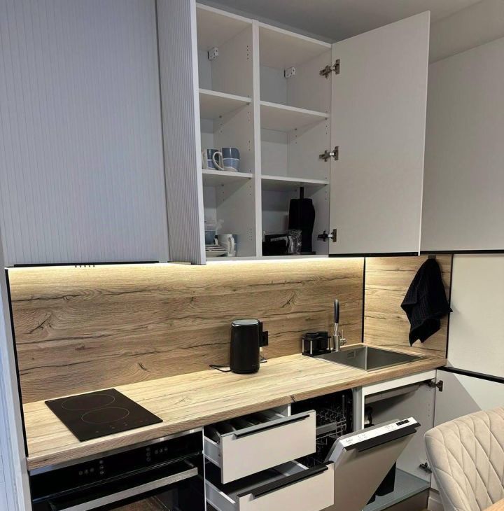 Из техники в квартире установлены и подключены: холодильник, вытяжка, варочная панель, духовой шкаф с встроенной микроволновкой, посудомоечная машина, стиральная машина, телевизор.