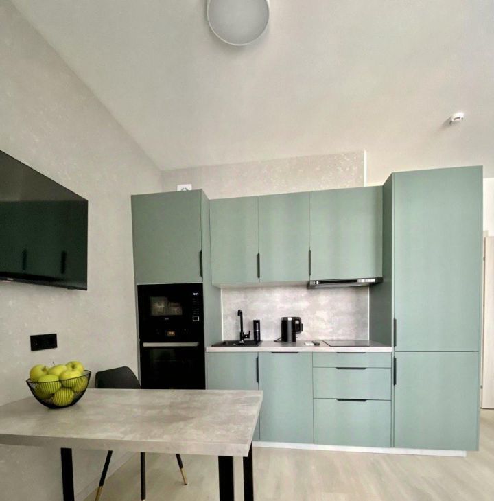 В кухонной зоне располагается стол в стиле лофт, а также анатомические стулья Shеffiltоn. Есть вся необходимая техника. Встроенные: духовой шкаф, микроволновая печь, посудомоечная машина, двухкамерный холодильник. Электрический чайник, большой телевизор с диагональю 42, стиральная машина, утюг с сушильной и гладильной доской, фен.