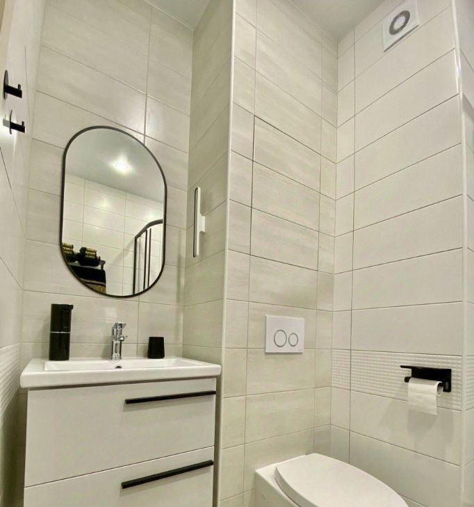 В санузле плитка керамо-гранит, а также теплый пол. Квартира легко убирается в том числе благодаря инсталляции и парящей тумбе в санузле. Удобная душевая размером 100*100. Есть проточный водонагреватель.