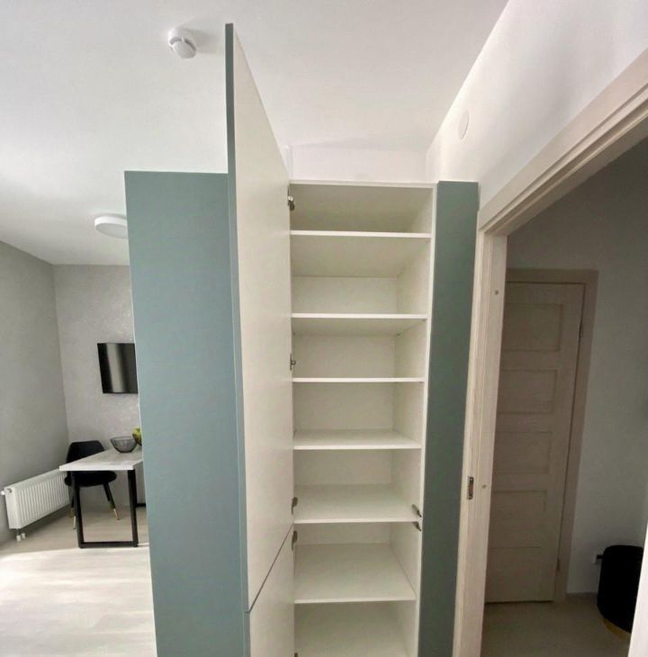 В проекте квартиры предусмотрено много мест для хранения, помимо большой гардеробной есть вместительный встроенный шкаф.