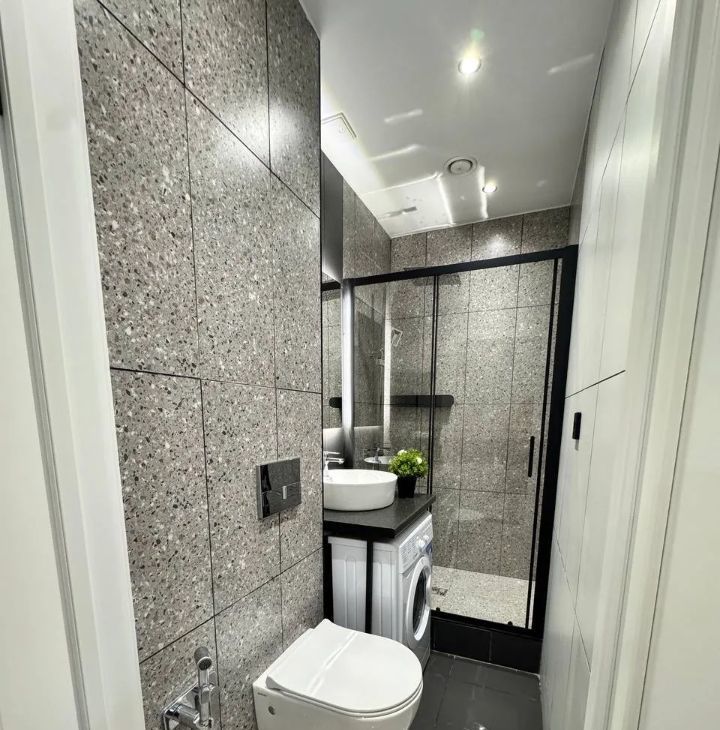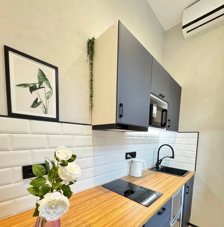 В студии выполнен новый ремонт: вся мебель и техника новые. Полный комплект техники, включая стиральную и посудомоечную машины, кондиционер.