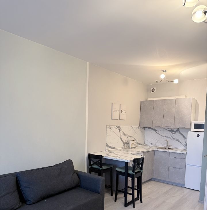 Сдается светлая и просторная студия на 11 этаже. Просторная кухня оборудована необходимой техникой: холодильник, плита, духовка и микроволновая печь. Из мебели — удобный диван и шкафы.