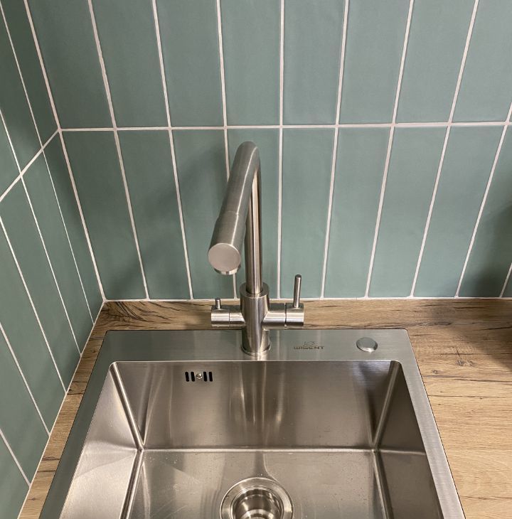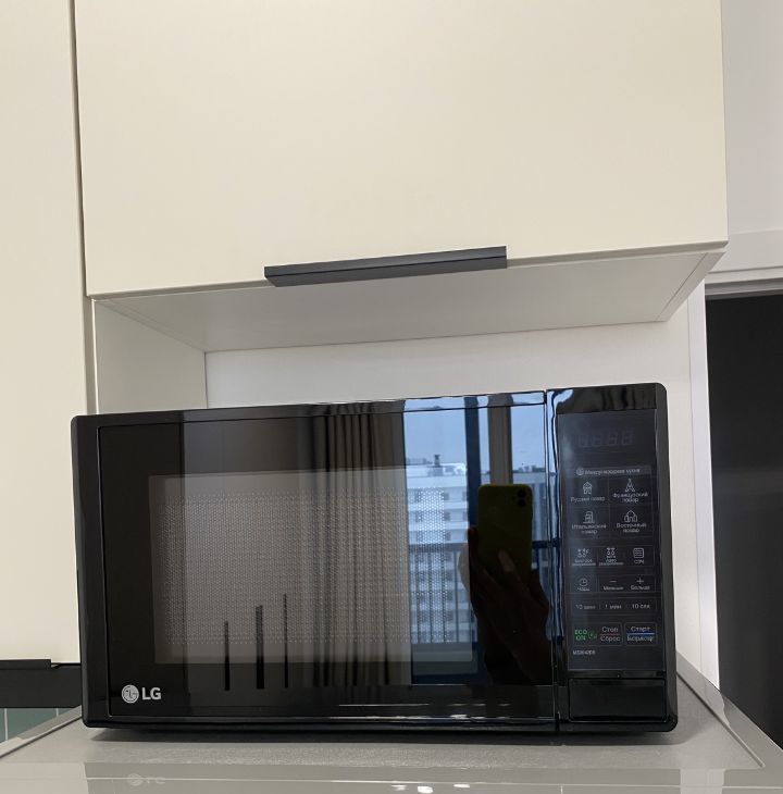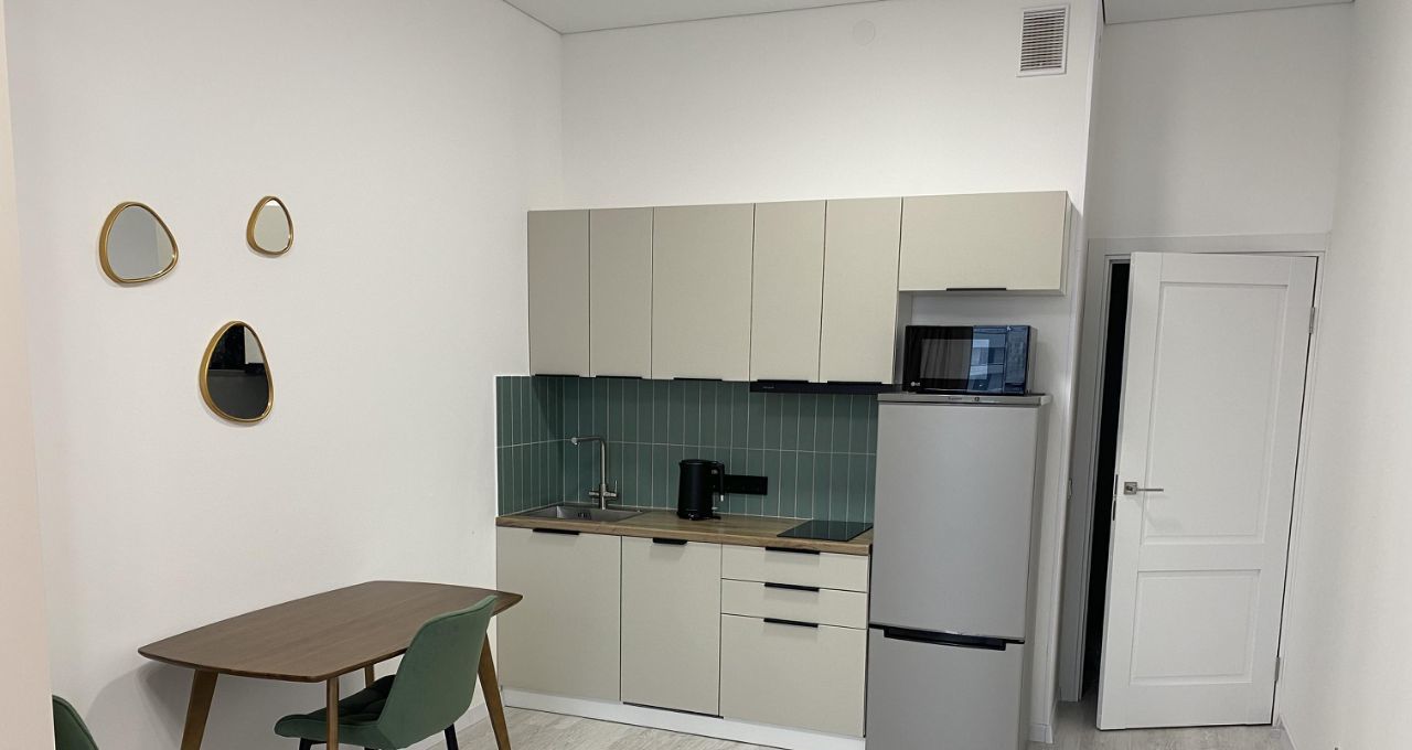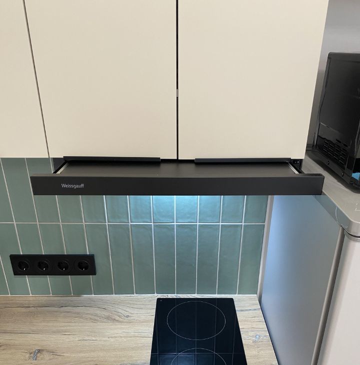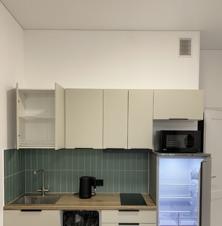 Кухня оборудована всем необходимым для человека, который спокойно относится к готовке. Есть плита, вытяжка с подсветкой, холодильник, микроволновка, электрочайник, посудомойка. При необходимости можно подключать дополнительные гаджеты для готовки. Предусмотрена возможность подключения фильтров для воды, кран с выводом для фильтрованной воды.