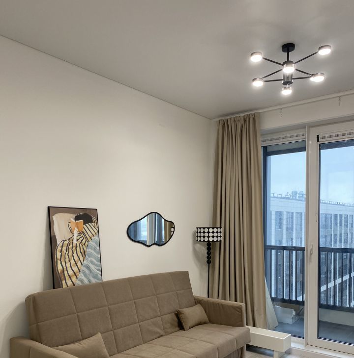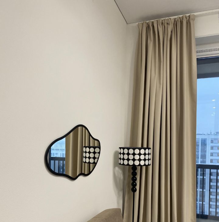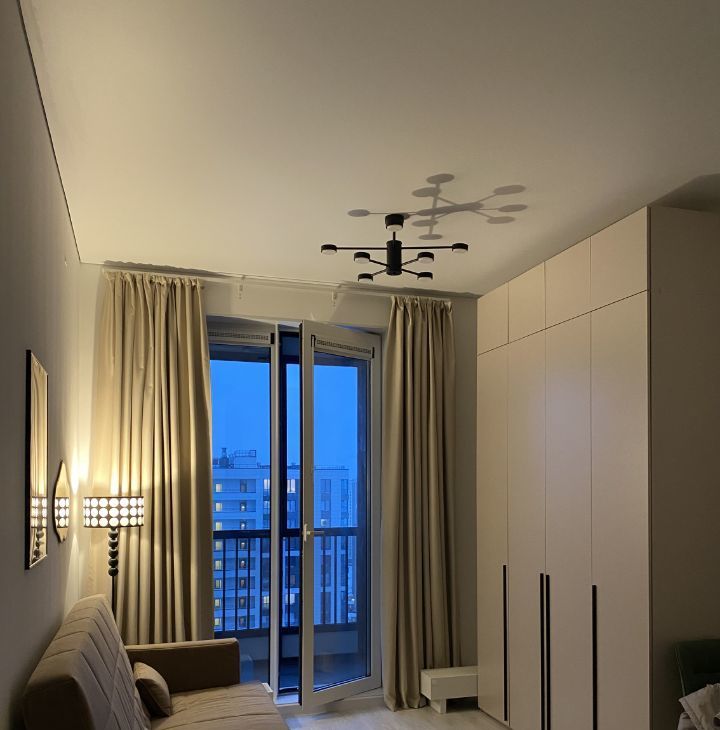 Диван выбирался с учетом комфорта для сна — отсутствие стыков, ортопедический матрас, ламели в основании. В диване есть короб для хранения. Шторы блэкаут для качественного отдыха.