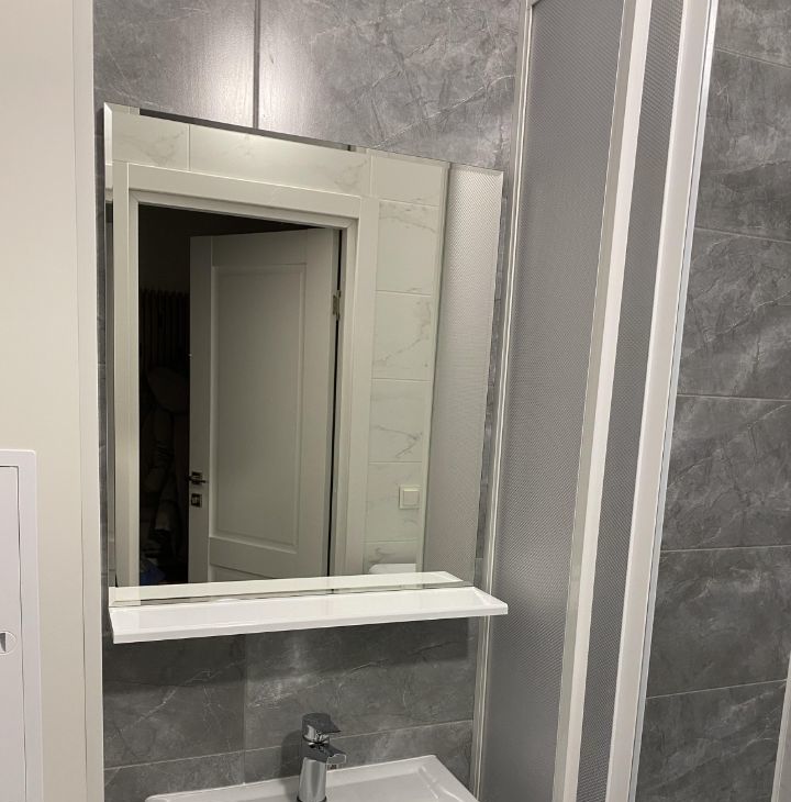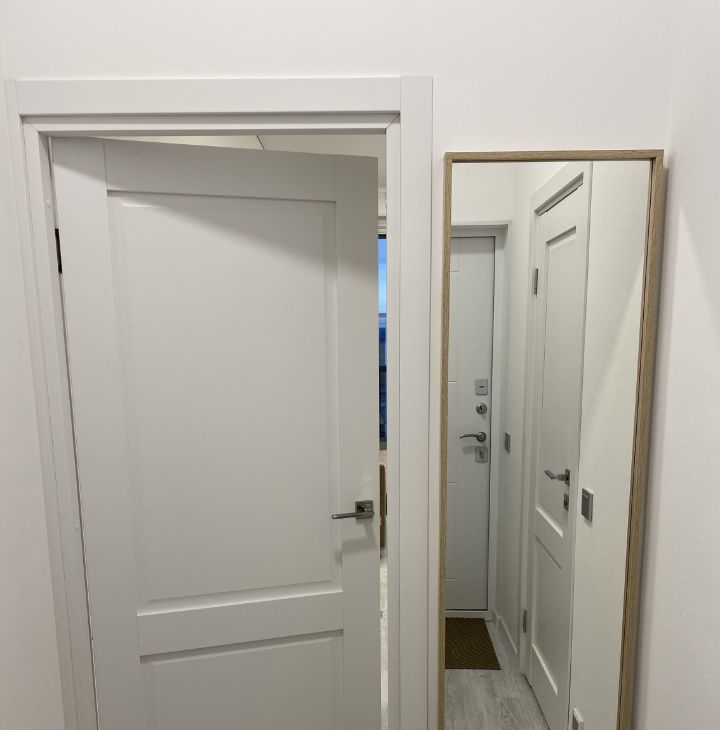 В прихожей удобное зеркало в полный рост, вместительные полки для обуви.