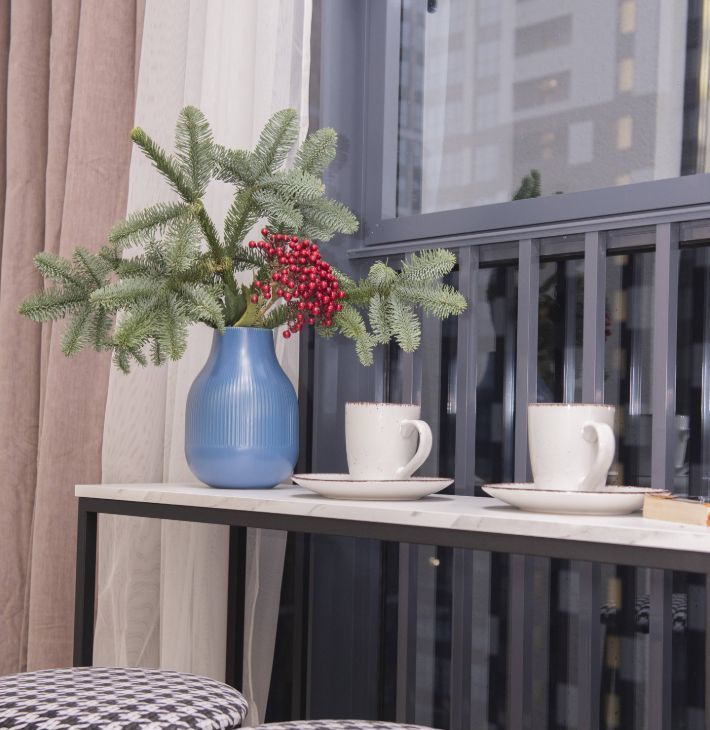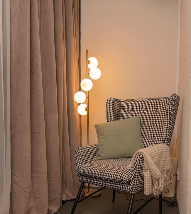 - Уютнейший просторный балкон с мягким стильным креслом, консолью и модным торшером, откуда вы не захотите уходить