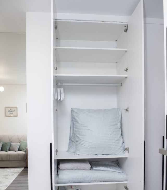 - Большие белые шкафы и удобная система хранения вещей, а так же наличие пылесоса, утюга, сушилки, гладильной доски