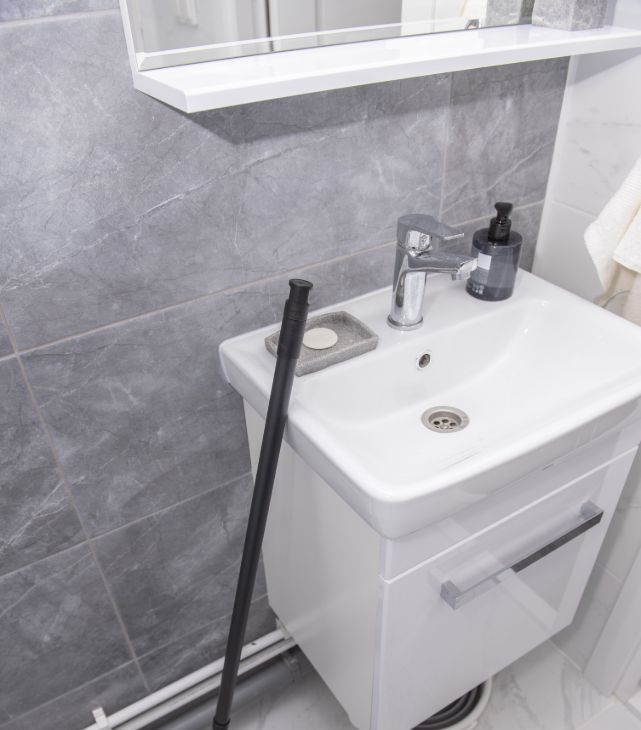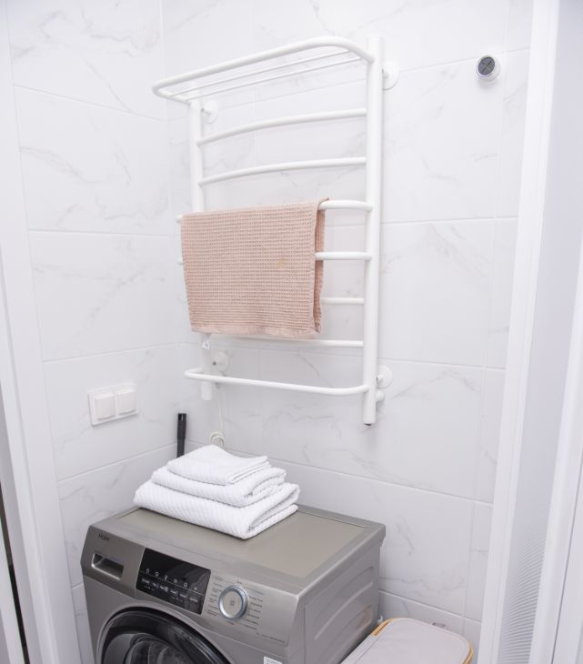 - Ванная комната, отделанная хорошей керамической плиткой, оснащенная тёплым полом и электрической сушилкой
