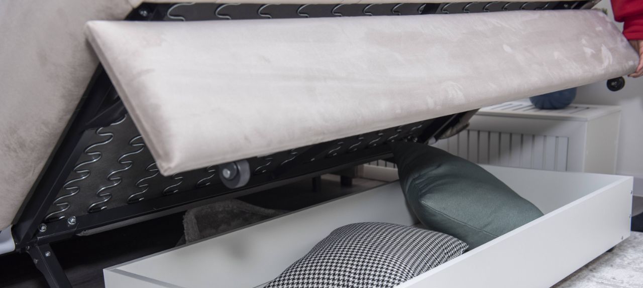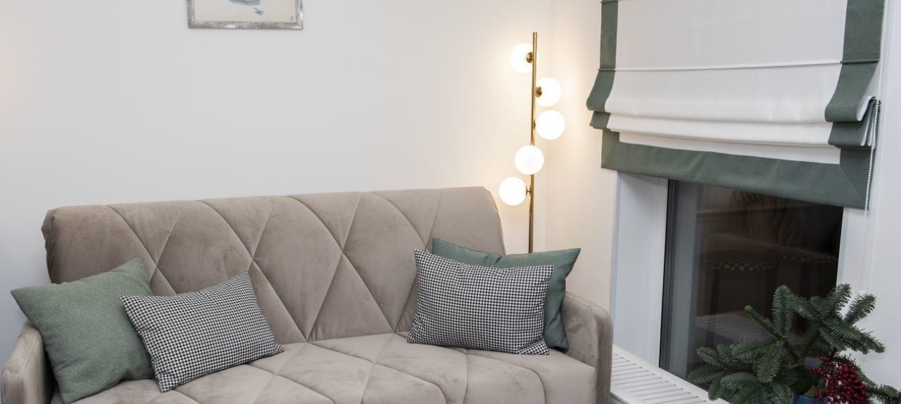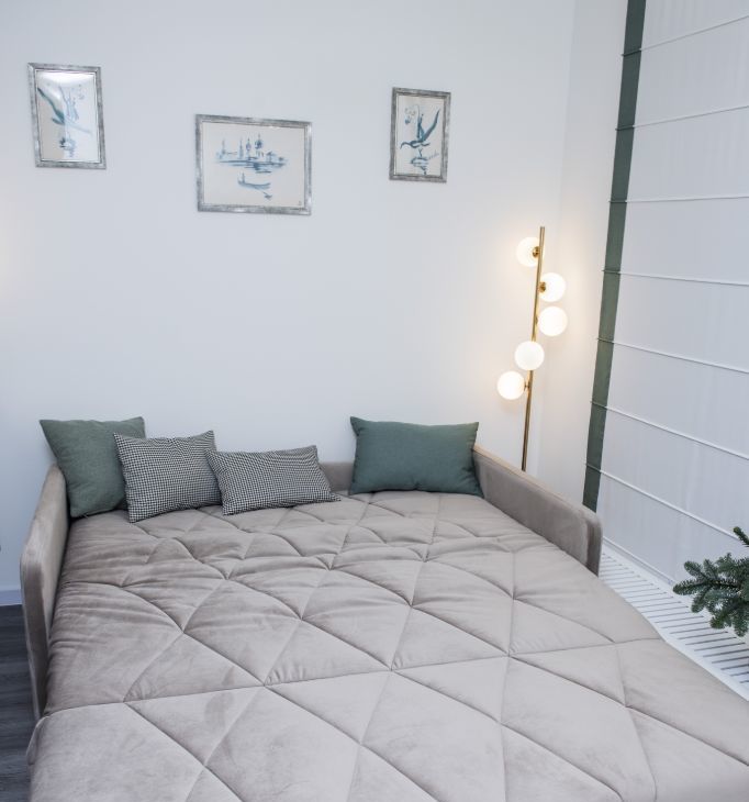 - Комфортная зона отдыха с мягким диваном-кроватью Ascona и множеством мягких подушек