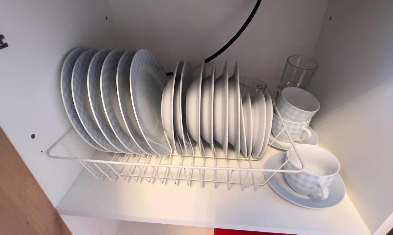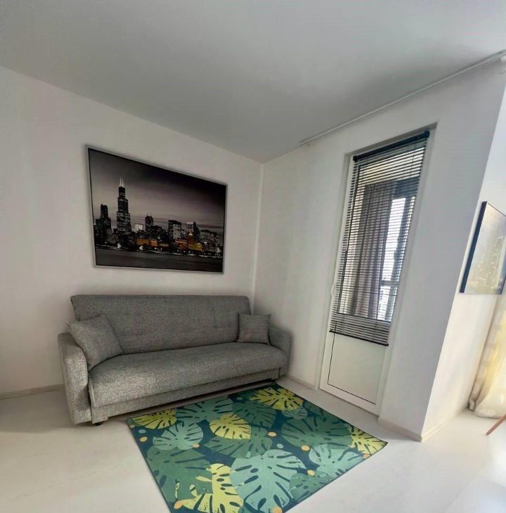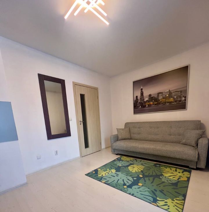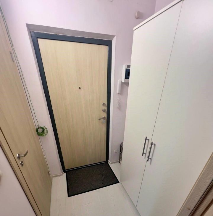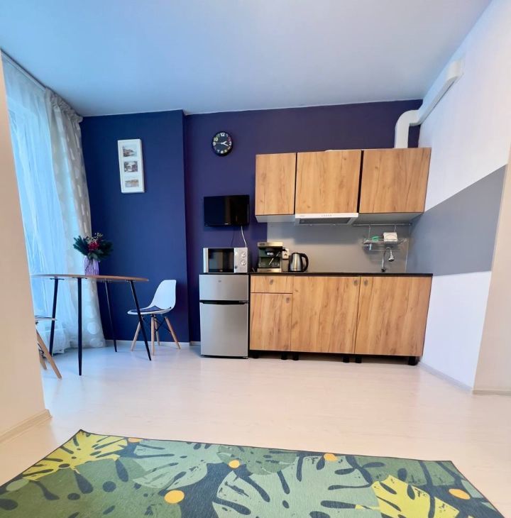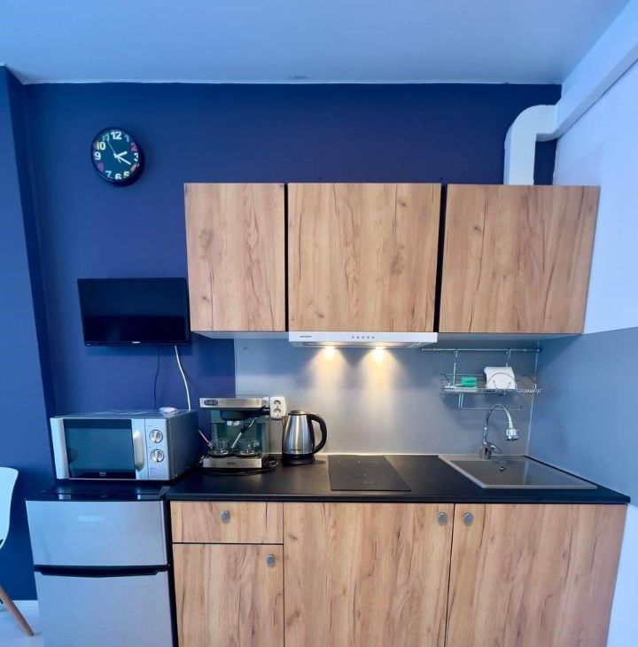 Кухня-гостиная: кухонный гарнитур новый, плита индукционная новая, вытяжка, холодильник новый, мойка акриловая новая, посуда, столовые приборы, двухместный диван, стол со стульями, телевизор. По желанию, сможем дополнить кроватью с матрасом ikea 160x200. Санузел: душевая кабина, стиральная машина. Входная зона имеет гардероб (шкаф) для хранения.