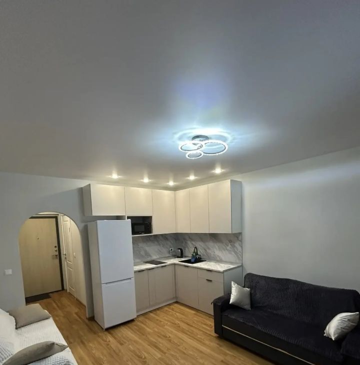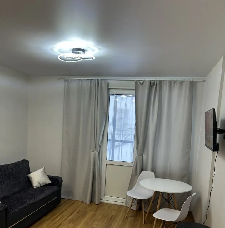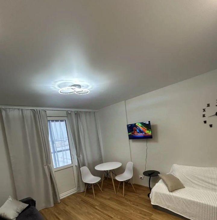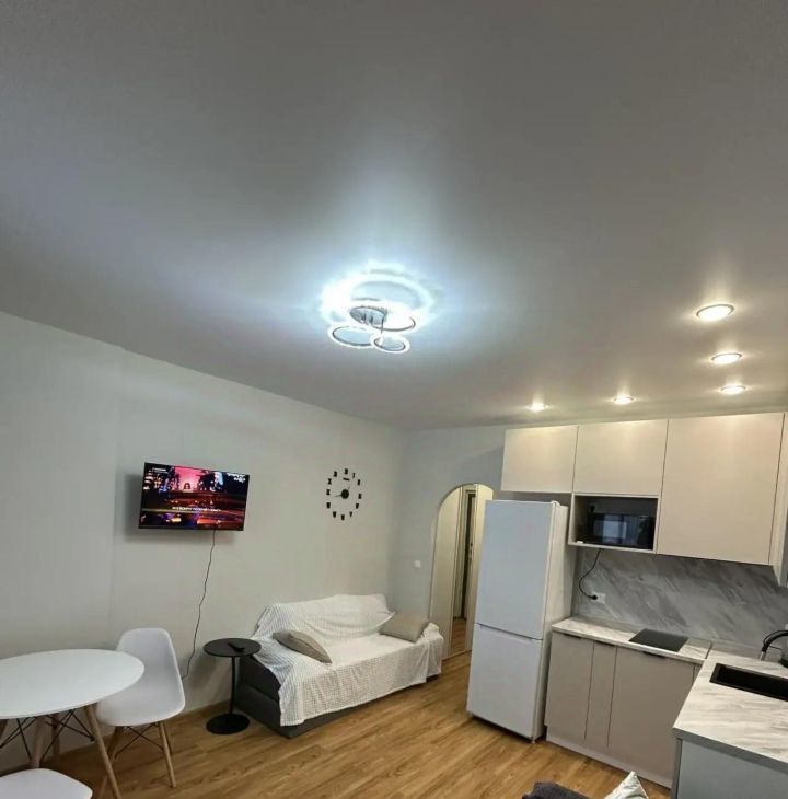 В квартире сделан евроремонт, что подчёркивает её современную и стильную атмосферу. В студии есть всё необходимое для комфортного проживания: мебель как на кухне, так и в комнате, а также необходимая техника — холодильник, телевизор и стиральная машина. Ванная комната оборудована душевой кабиной и совмещена с санузлом. Также в квартире есть лоджия, где можно насладиться свежим воздухом.