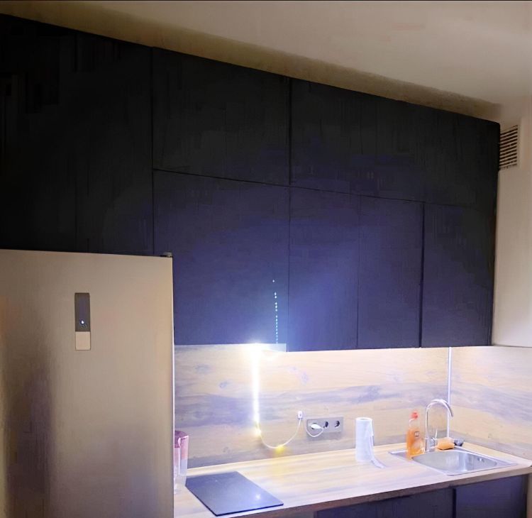 -зонированная от спальной зоны кухня с холодильником и индукционной плитой