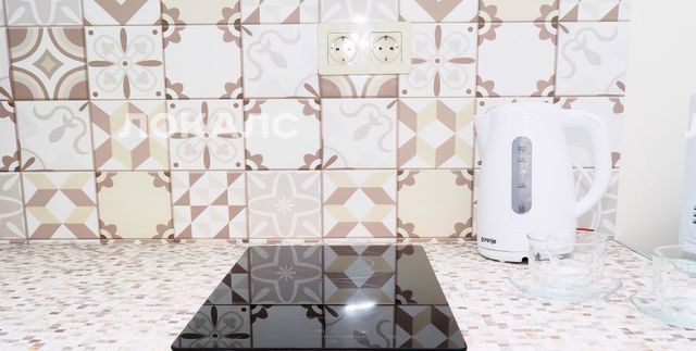 Кухонная зона: микроволновая печь, плита, мини холодильник, чайник, посуда и столовые приборы.