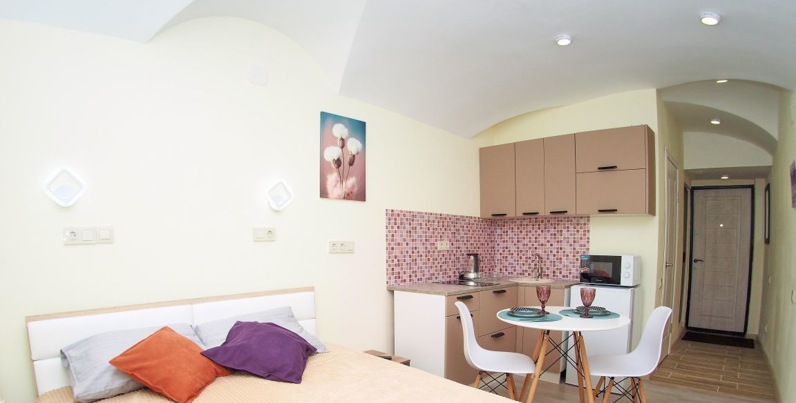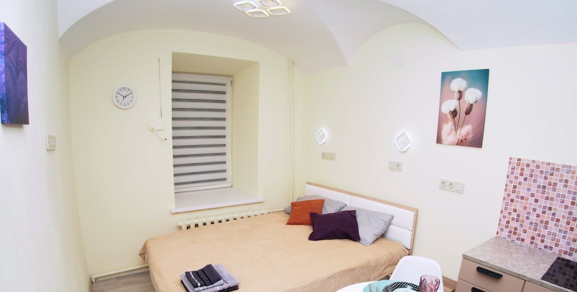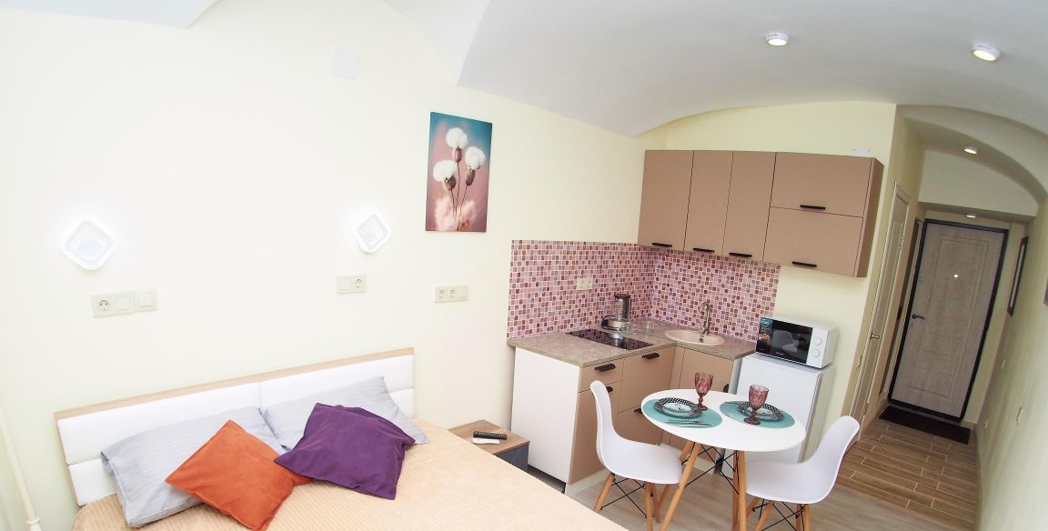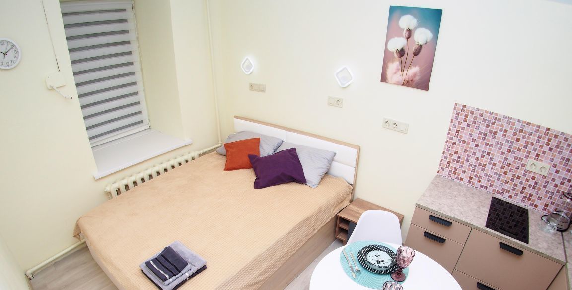 Комфортное размещение для 2 человек в каждой студии. Двуспальная кровать (160 см) с анатомическим матрасом