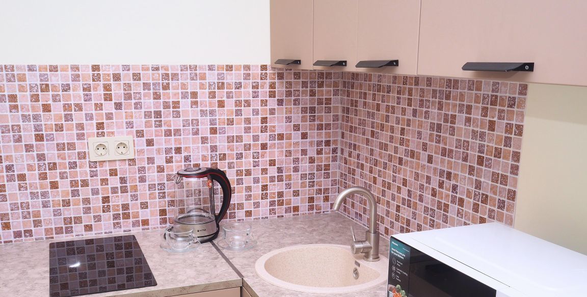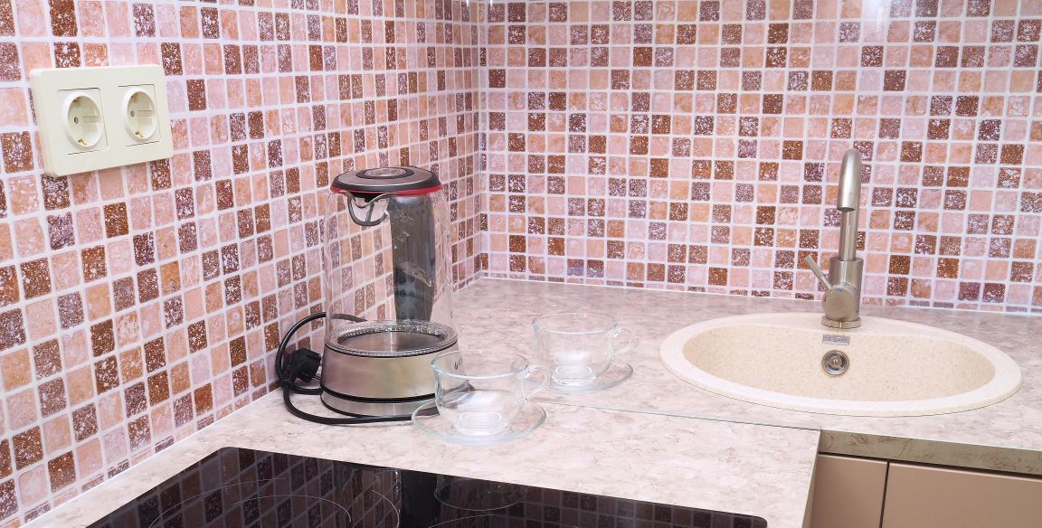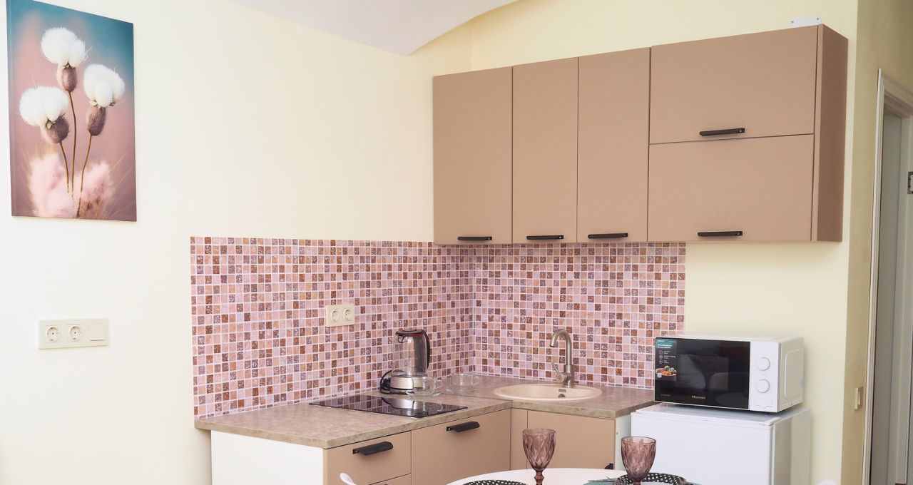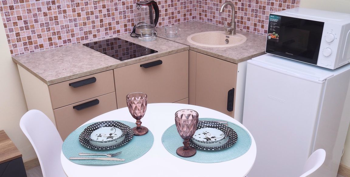 Кухонная зона: микроволновая печь, плита, мини холодильник, чайник, посуда и столовые приборы.