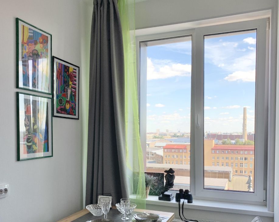 Вид из окон на исторический центр и архитектур ныне достопримечательности (Петропавловская крепость, Исаакиевский собор, видны купола храмов и шпиль Адмиралтейства, а также в бинокль (прилагается к квартире) можно увидеть ангела на Александрийском столпе Дворцовой площади).
