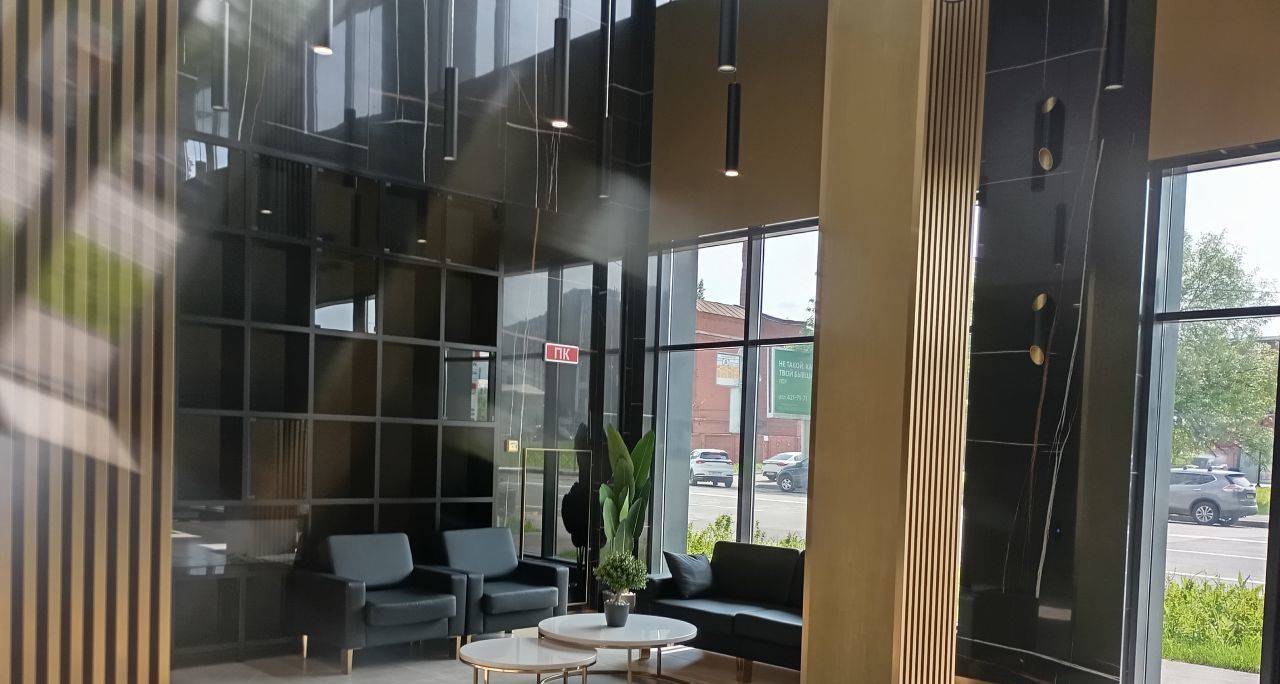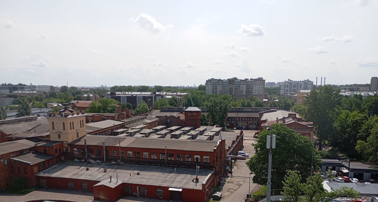 Площадь студии 24 метра, площадь комнаты 18 метров (не вытянутая), большая лоджия с видом на исторические здания с башней( кирпичный стиль начала 20-го века) и дальше на город. Очень красивый подъезд, есть лобби с креслами, камином, работает консьерж.