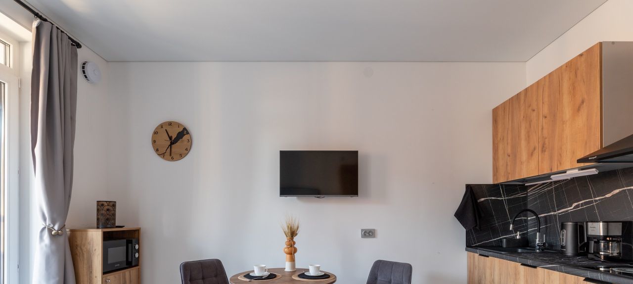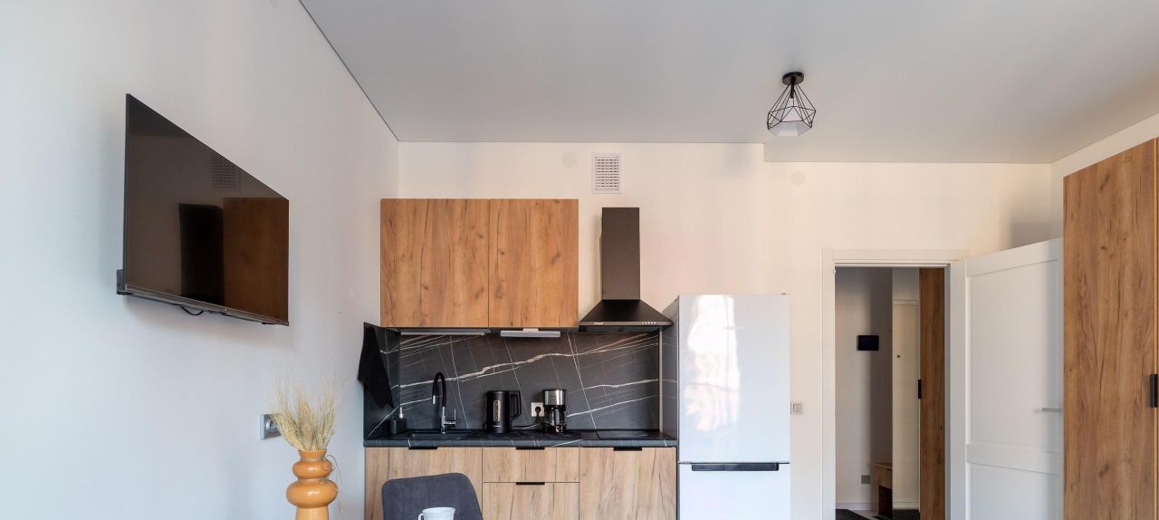 Полностью оснащенная кухня: холодильник, индукционная панель, вытяжка, микроволновая печь, чайник, посуда для готовки и сервировки.