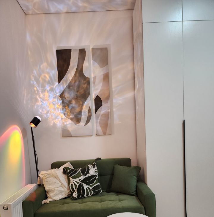 Зона отдыха с диваном ,журнальным столиком и дизайнерским светильником, позволяющим менять освещение в зависимомти от настроения;