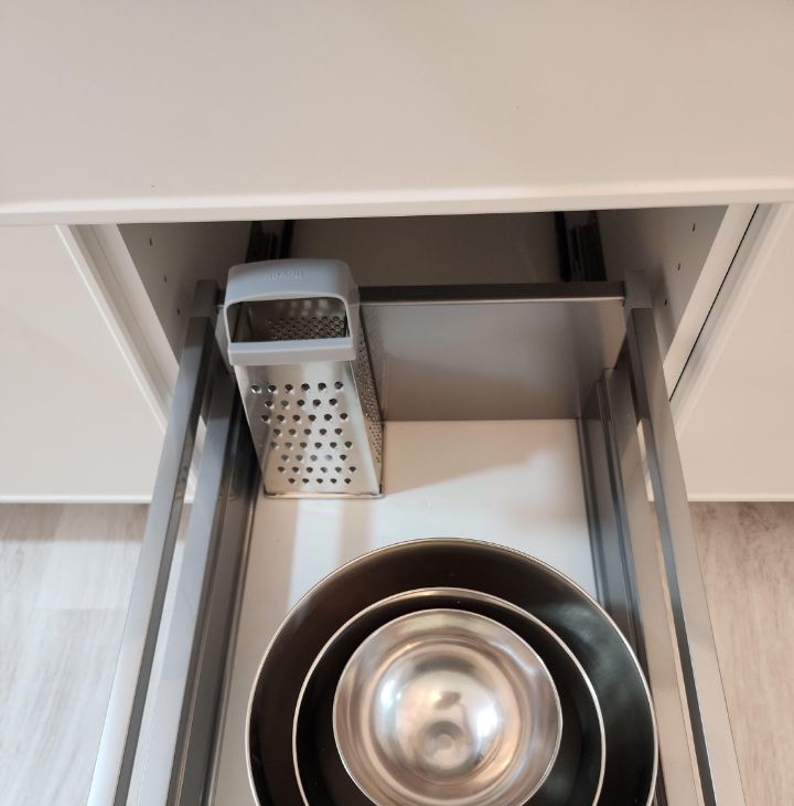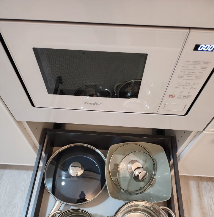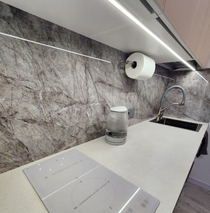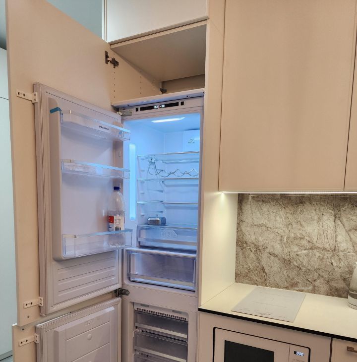 функциональная кухонная зона с встроенной техникой(варочная панель, посудомоечная машина, холодильник, микроволновка);