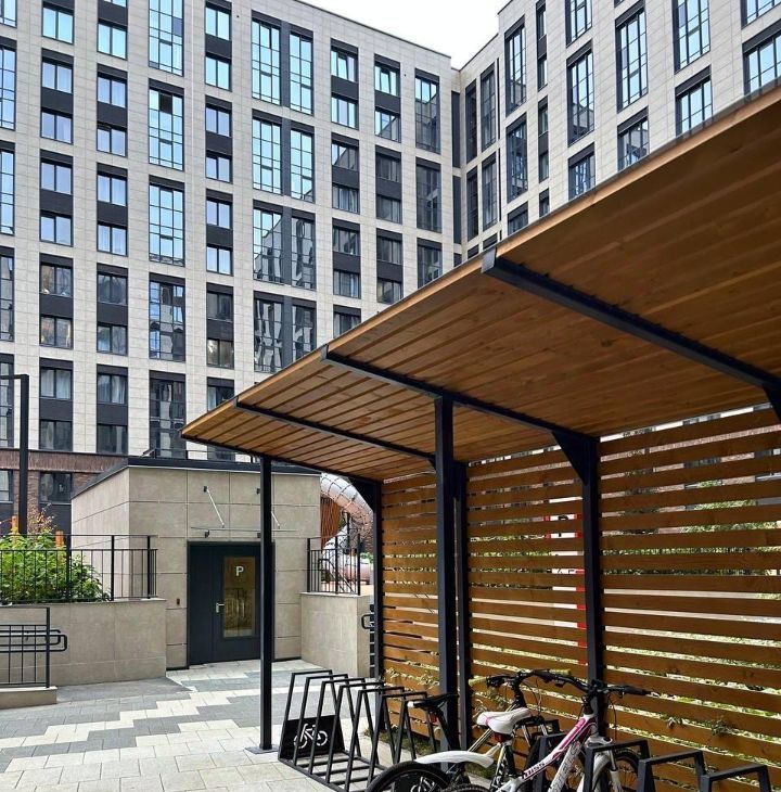 Дом класса высокий комфорт включает в себя отдельные входные группу с консьержем и местами для отдыха (диваны, столики, электрокамин) колясочные, парковки для велосипедов, спортивную площадку для взрослых и детей, а так же просторную парковку на территории комплекса.