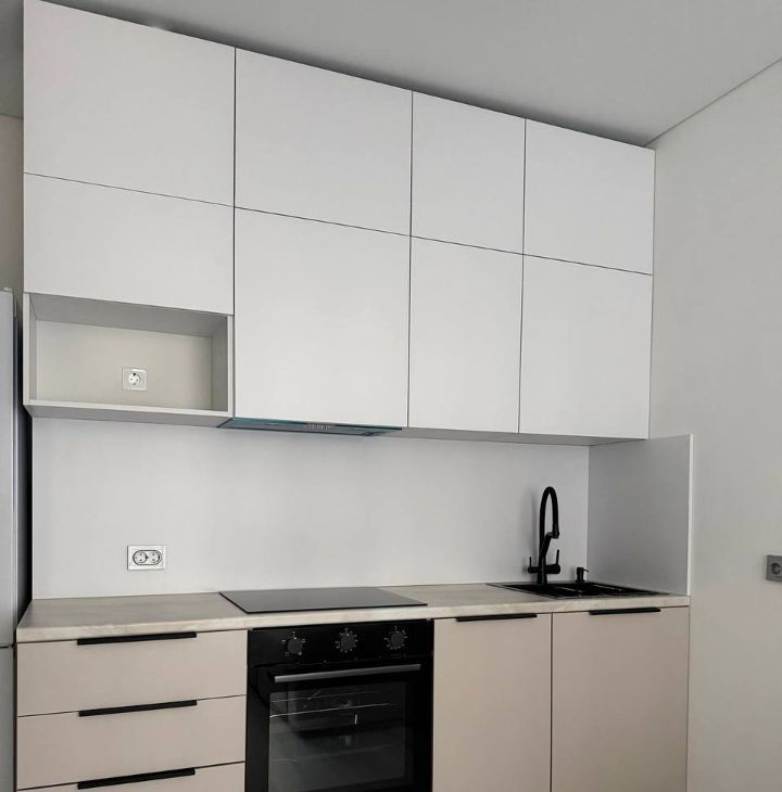 Просторная комната с диваном, рабочим местом, шкафом для одежды и кухонной зоной (плита, духовой шкаф, мойка, посудомоечная машина, холодильник, места для хранения).