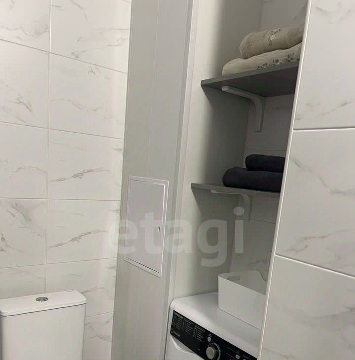 Совмещенный санузел с теплыми полами оборудован новой душевой кабиной и стиральной машиной. В коридоре встроенный просторный шкаф по индивидуальному заказу.